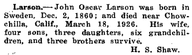 Larson.--John Oscar Larson was born in Sweden, Dec. 2, 1860; and died near Chowchilla, Calif., March 18, 1926. his wife, four sons, three daughters, six grandchildren, and three brothers survive.
