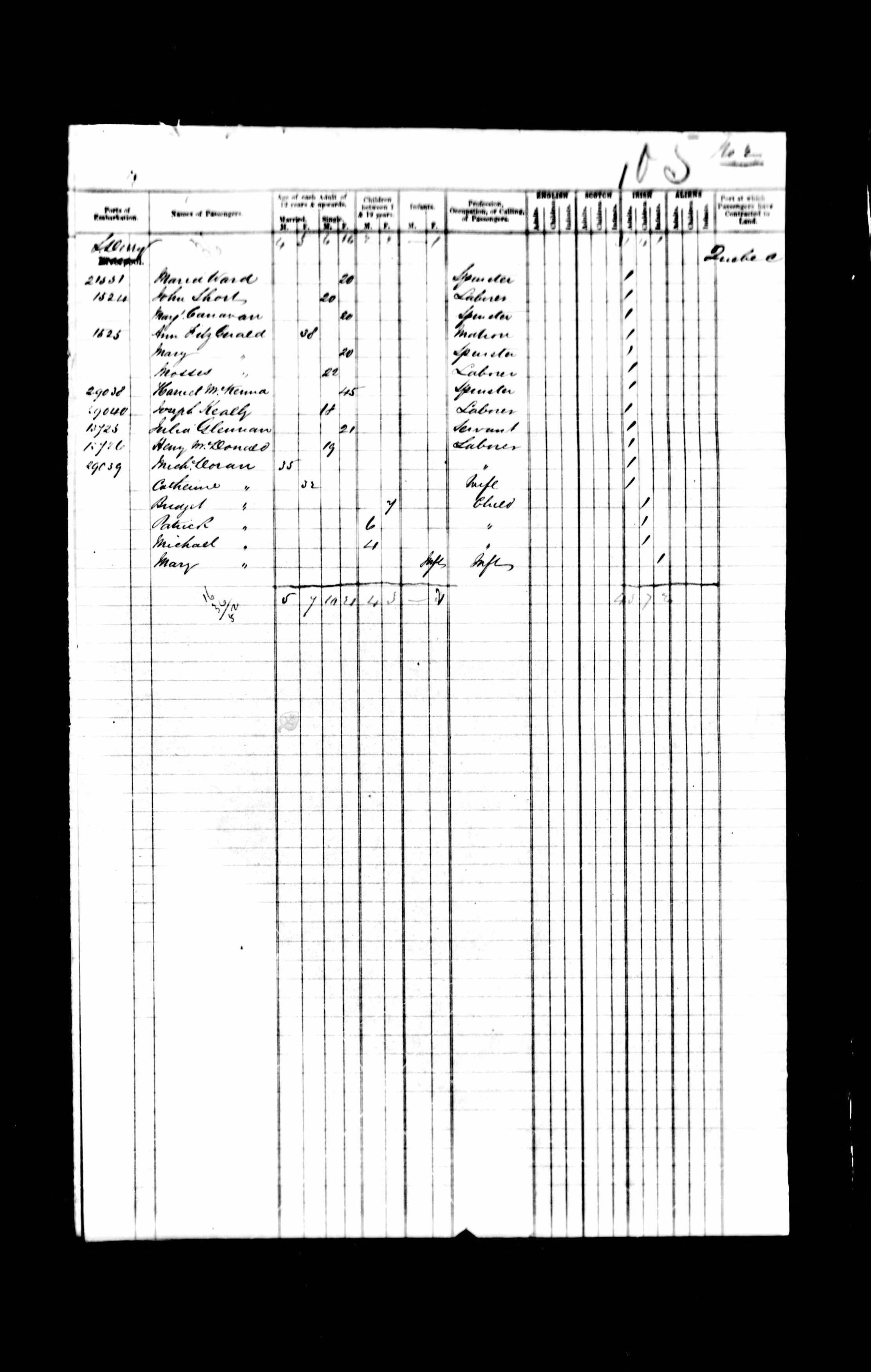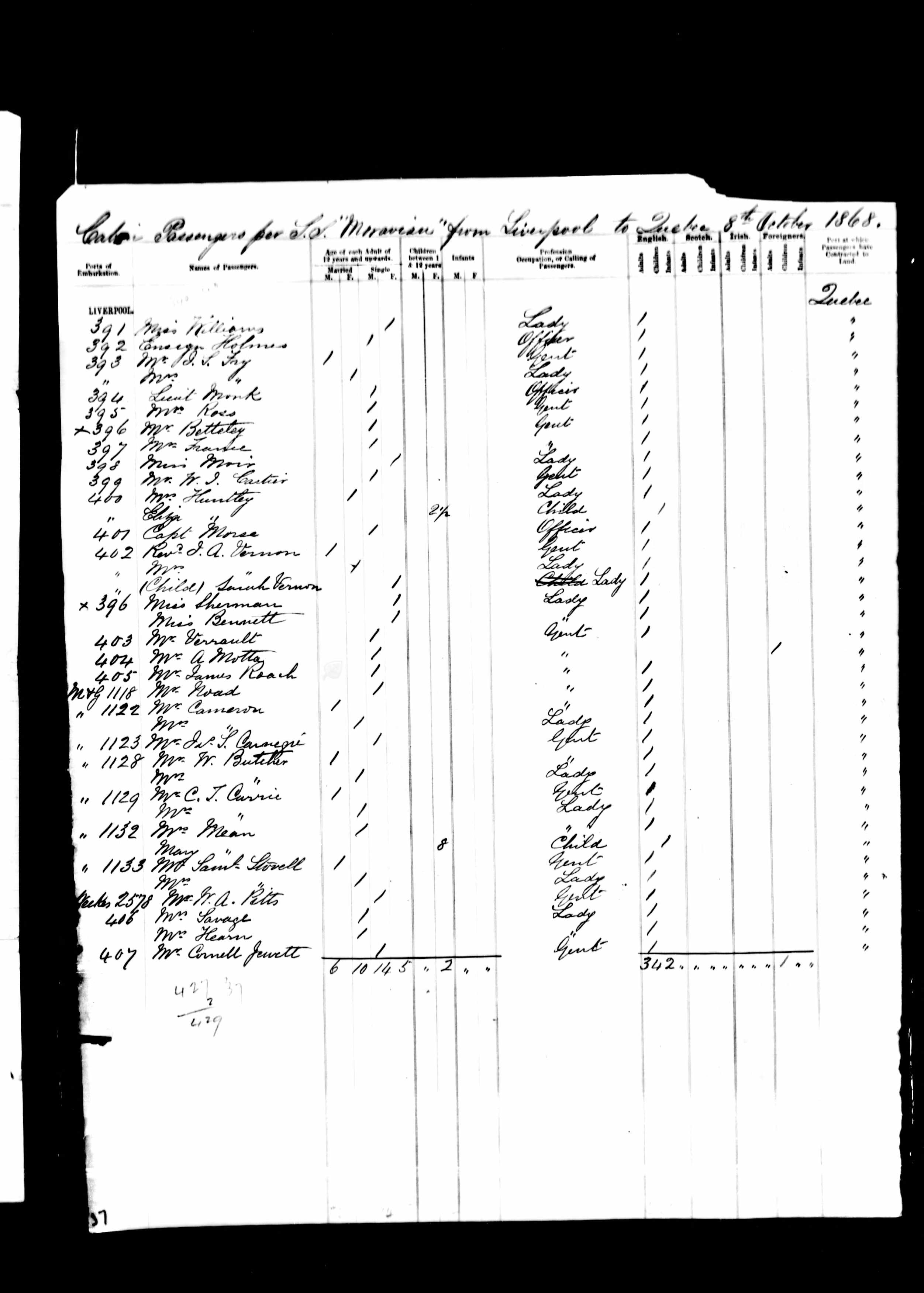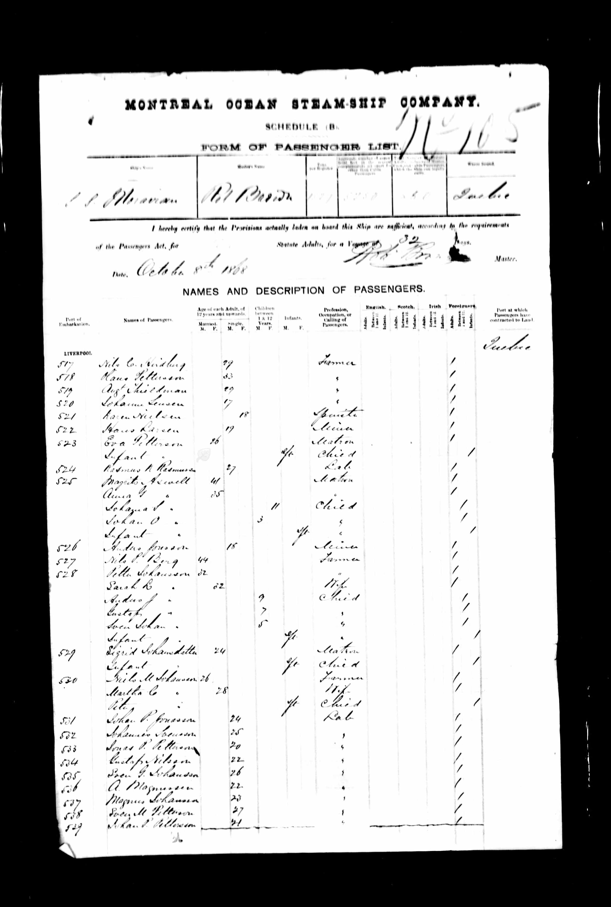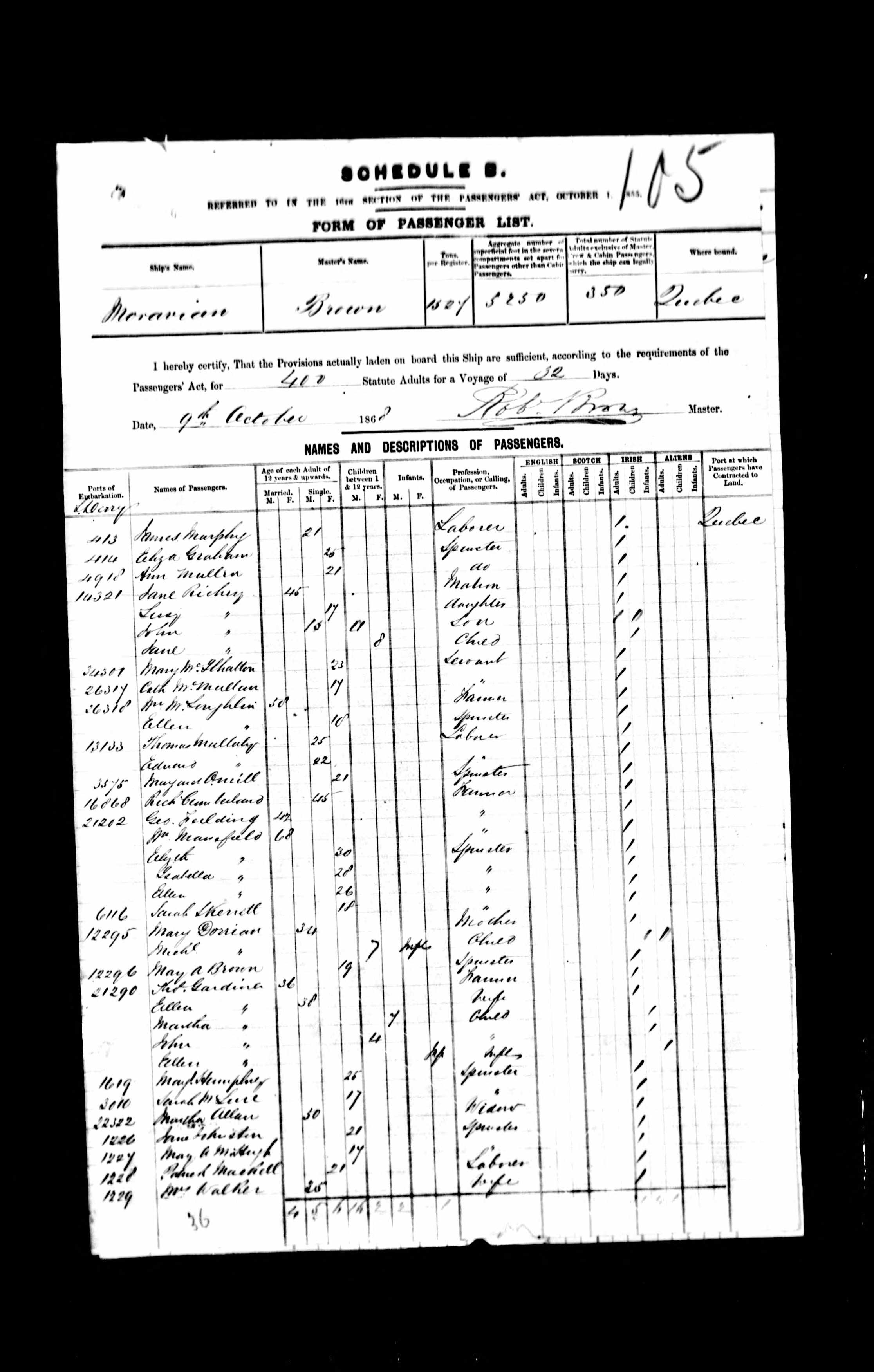 928. “Moravian Passenger Manifest,” October 8, 1868, Port of Quebec, Quebec City, QB, Canada, 5, 30, Microfilm, C-4523, 81866.