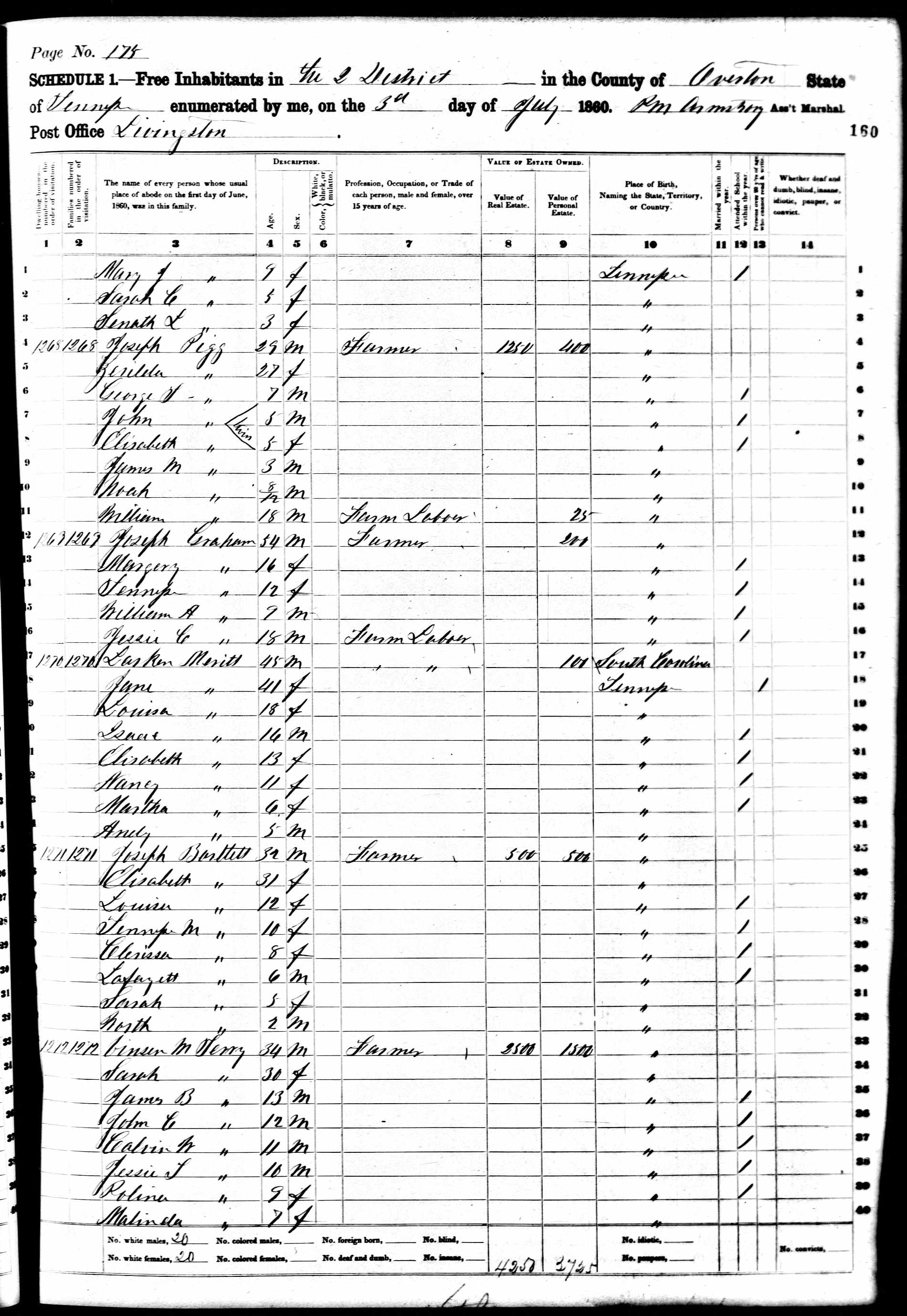 1511. “Eighth Census of the United States. Schedule No. 1.--Population,” Bureau of the Census, US Dept. of Commerce, United States of America, 1860, Tennessee, Overton, District 02, Livingston, July 3, 1860, PM Anmatory?, 175, M653, 1267, 160, 327.