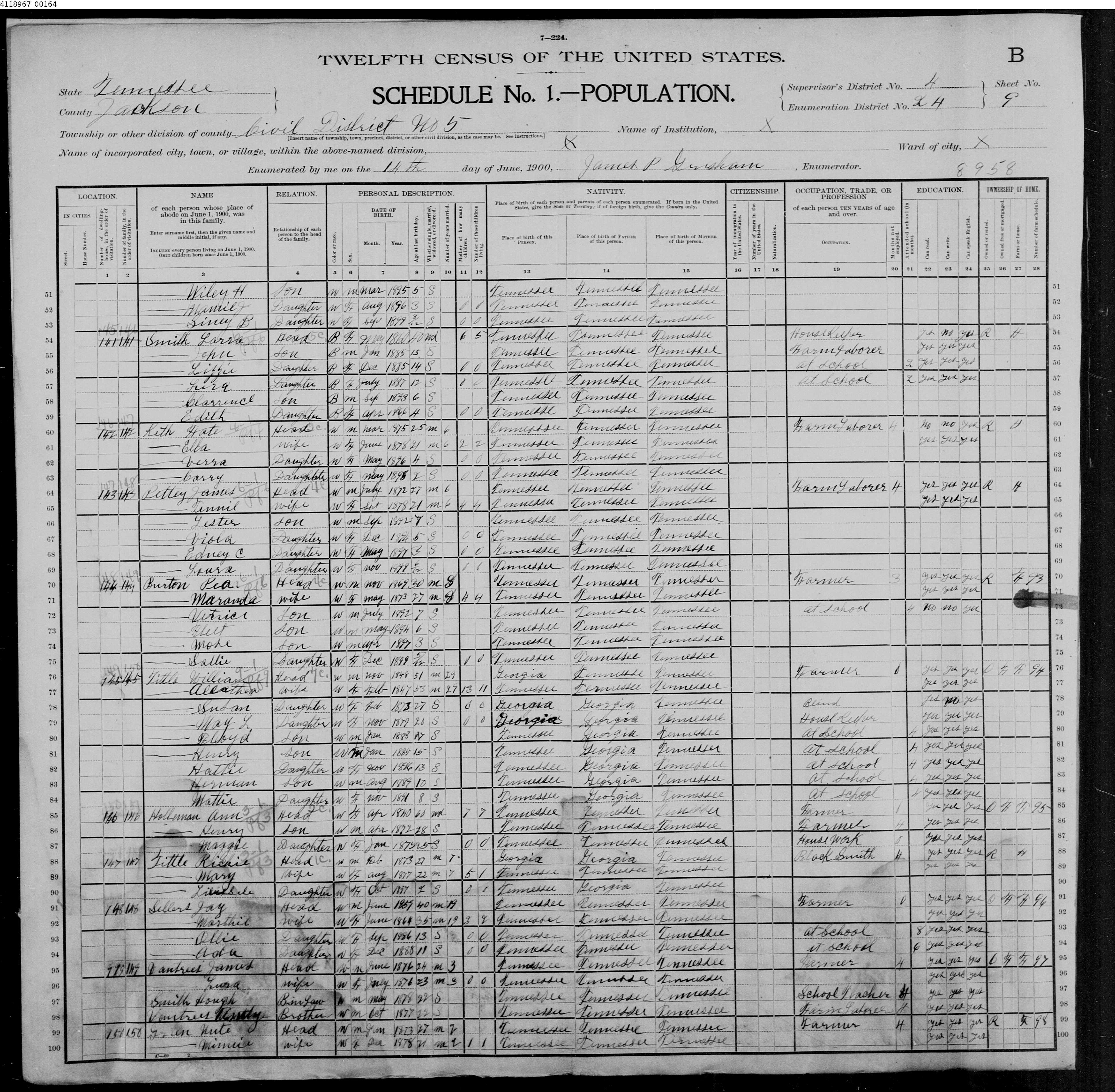 1514. “United States Census: 1900,” TN, Jackson, Civil District 05, June 14, 1900, James P Grisham, 9B, 4, 24, T623, 1241580, Bureau of the Census, US Dept. of Commerce, United States of America, 1900.