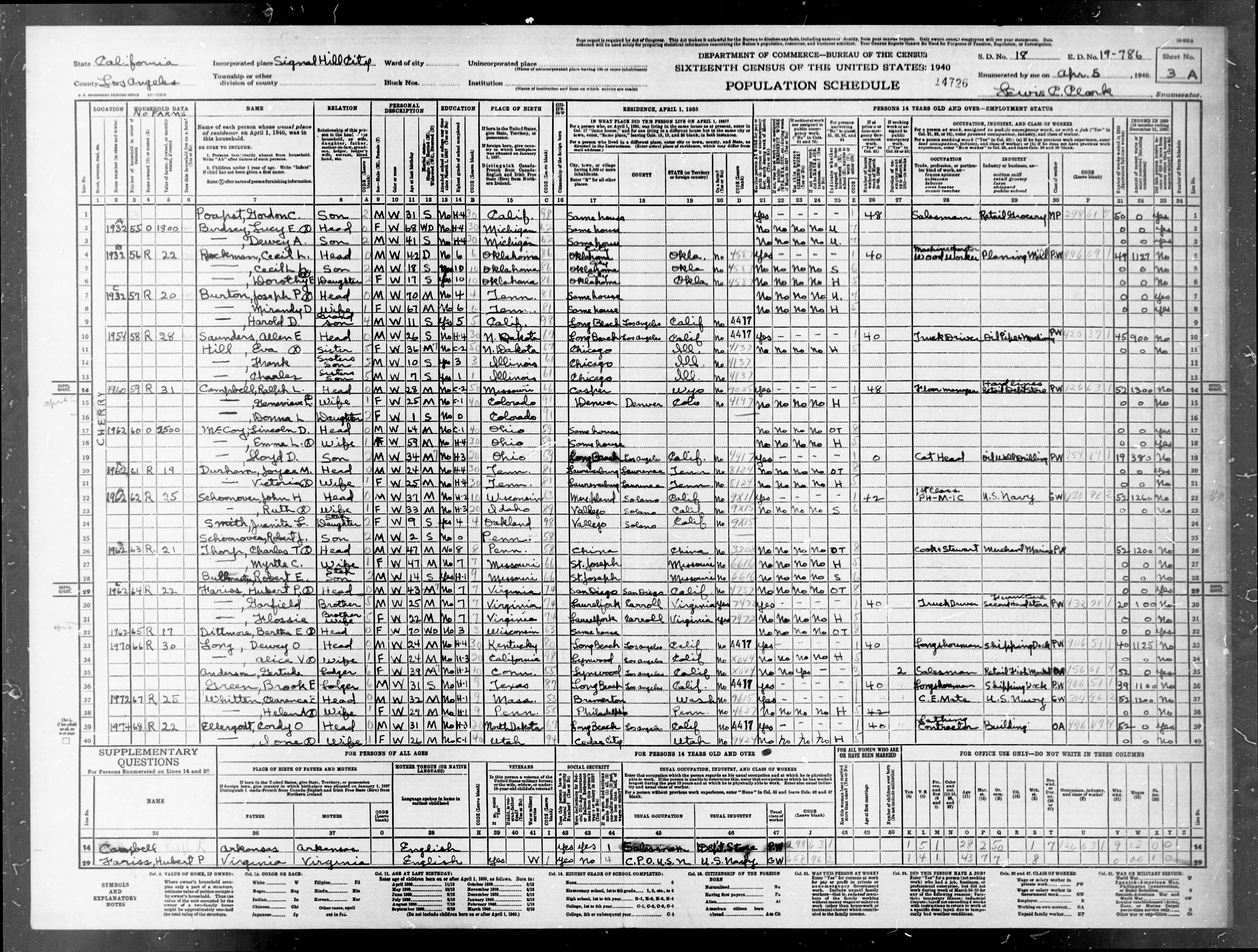 1516. “United States Census,” 1940, CA, Los Angeles, Signal Hill, Tract 334, 3A, 18, 19-786, T627, 258, 61, Bureau of the Census, US Dept. of Commerce, United States of America, April 5, 1940, Lewis P Clark.