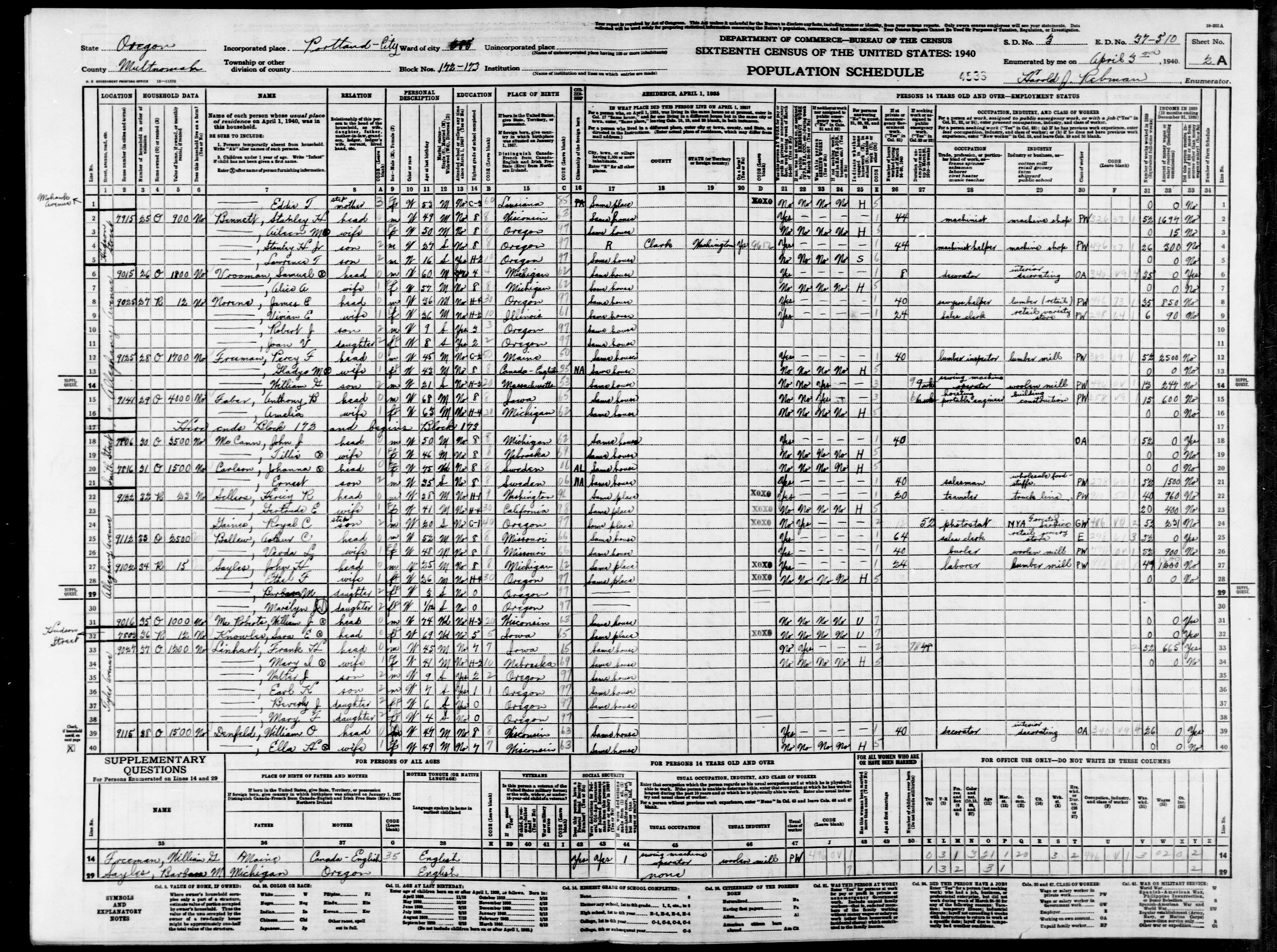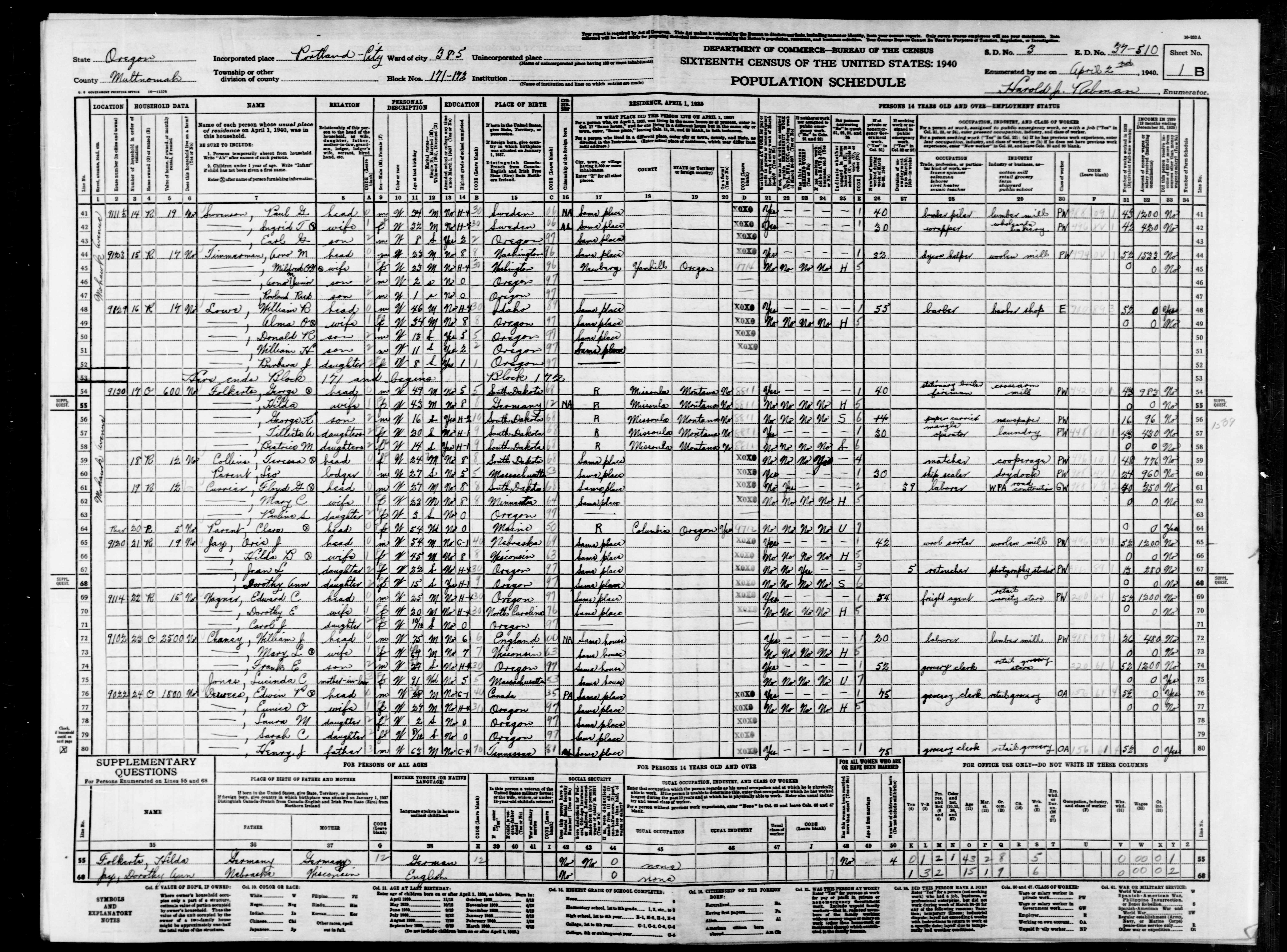 1525. “United States Census: 1940,” Bureau of the Census, US Dept. of Commerce, United States of America, 1940, OR, Multnomah, Portland, Tract 41, Precinct 385, 1B-2A, 37-510, T627, 3394, 455.