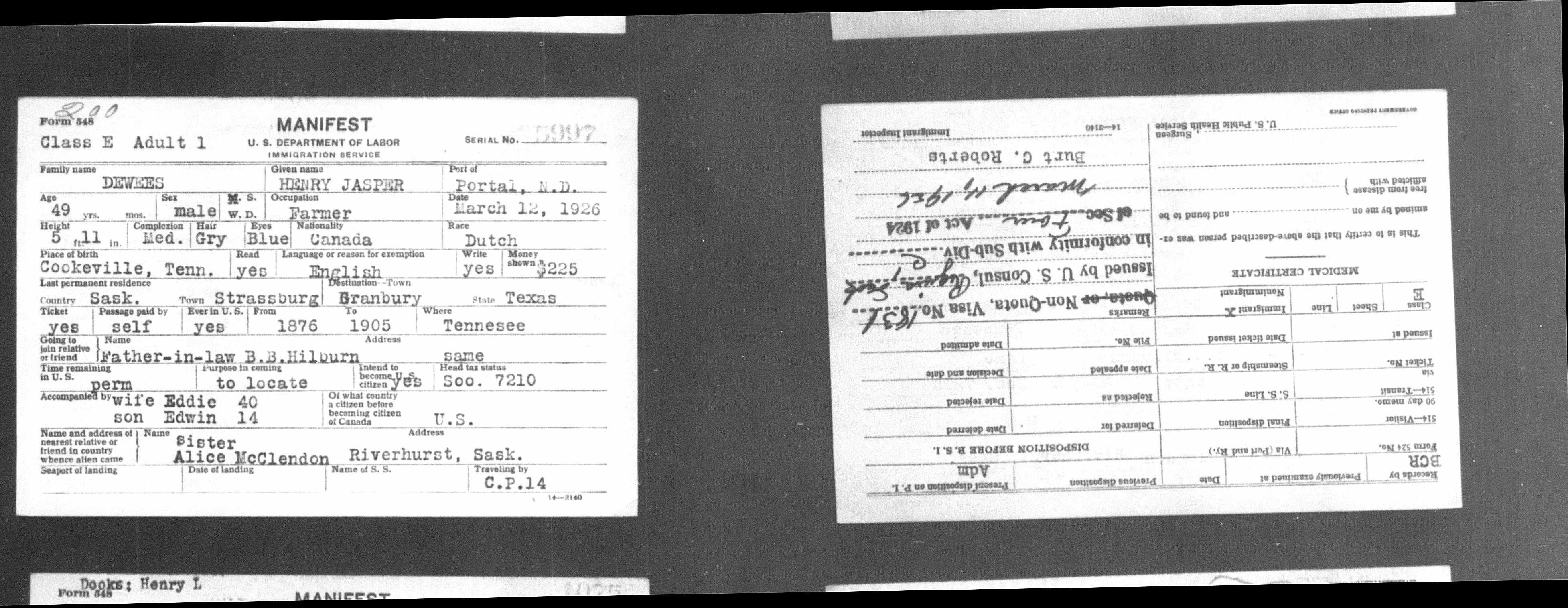 1527. Henry Jasper Dewees, “Vermont, St. Albans Canadian Border Crossings, 1895-1954,” March 12, 1926, Portal, ND, https://www.familysearch.org/ark:/61903/1:1:QK3T-SGRG.