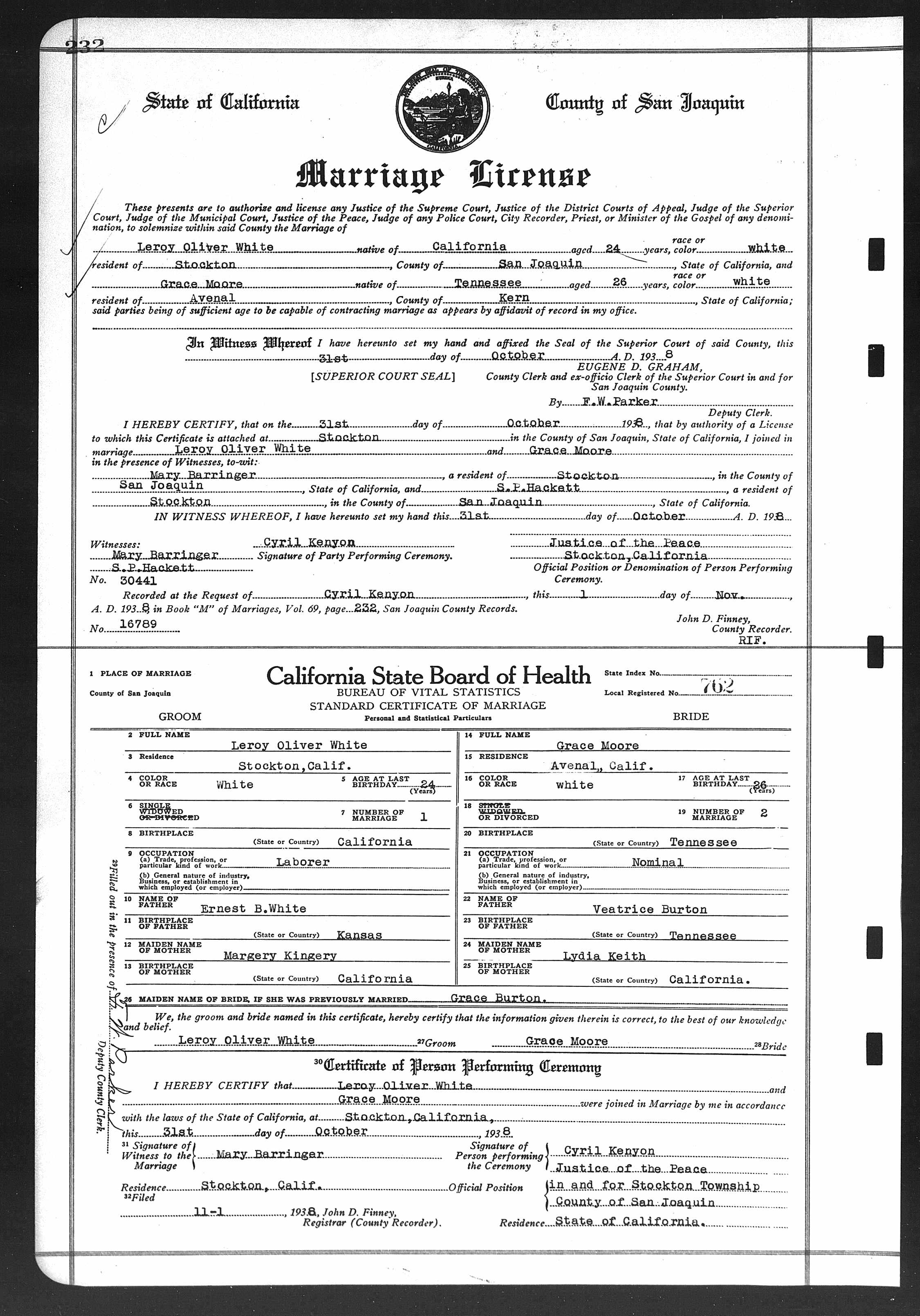 1538. Leroy Oliver White and Grace Moore, “California, County Marriages, 1850-1952,” October 31, 1938, Stockton, San Joaquin County, CA, GS Film number: 1841877 , Digital Folder Number: 005706896 , Image Number: 01246, https://familysearch.org/ark:/61903/1:1:K82B-7G2.