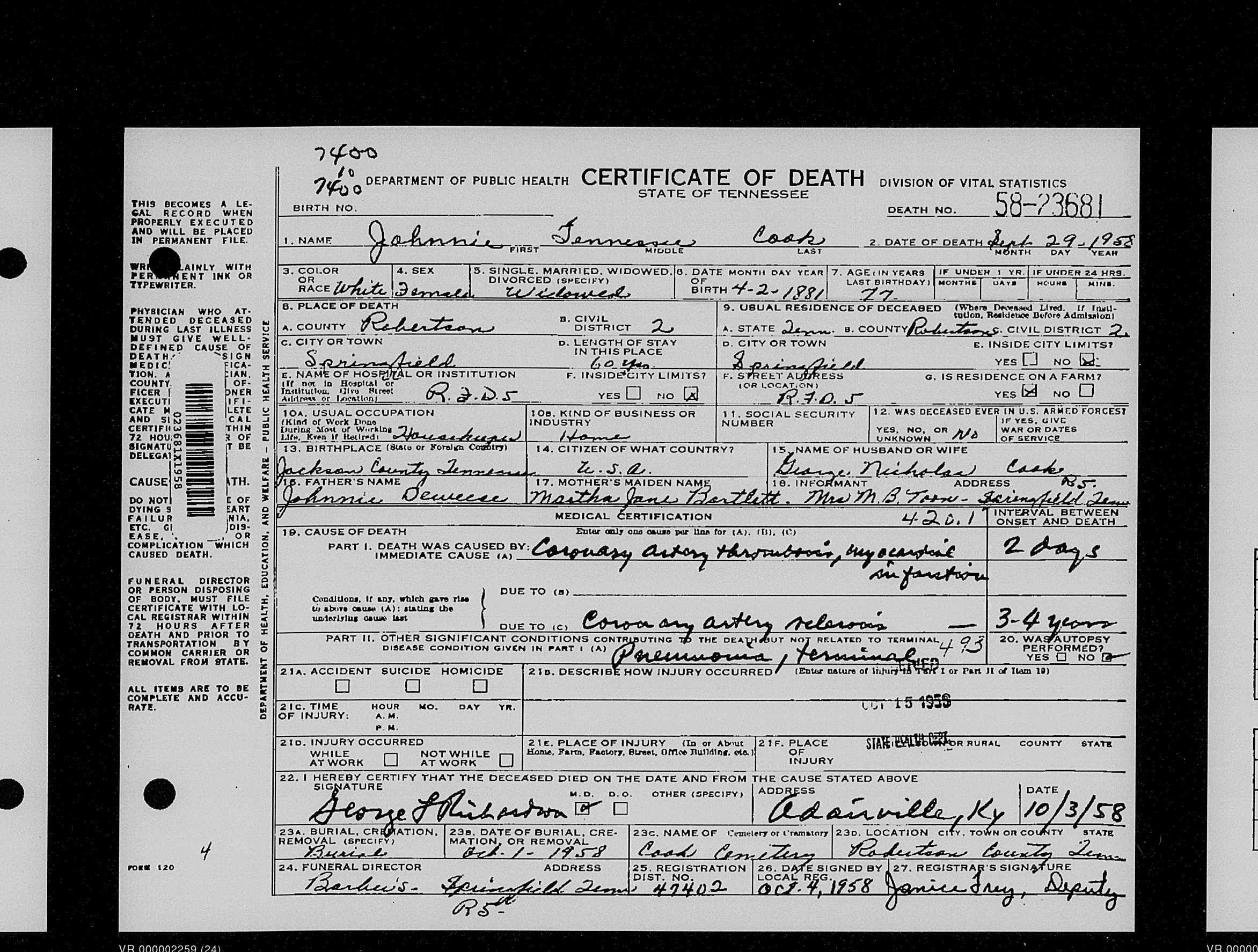 1541. Johnnie Tennessee Cook, “Tennessee Death Records, 1914-1963,” September 29, 1958, Springfield, Robertson County, TN, https://www.familysearch.org/ark:/61903/1:1:QKM9-YK7K.