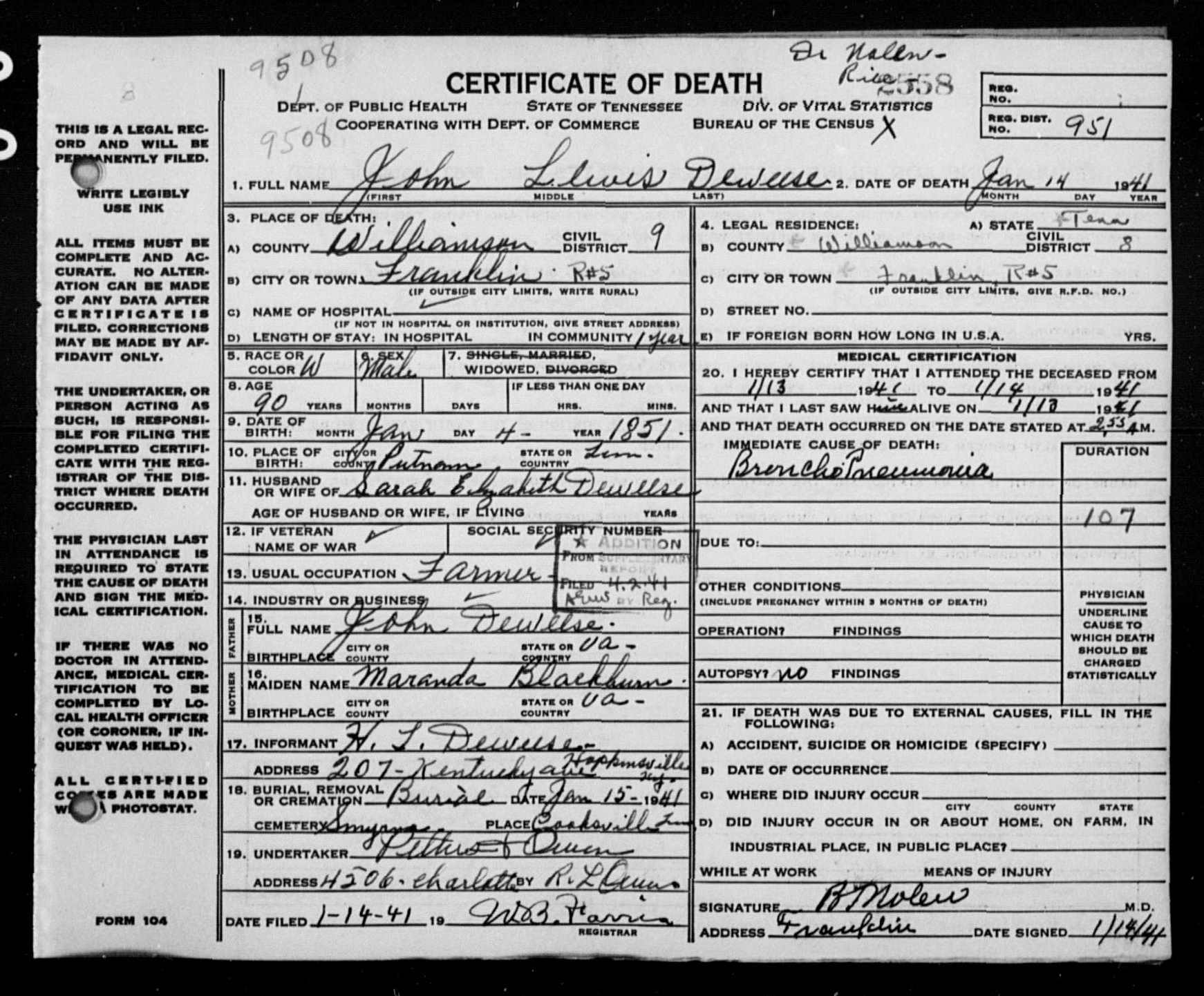 1706. John Lewis Deweese, “Tennessee Death Records, 1914-1955,” microfilm, digital folder number: 4184461-image number: 72-film number: 1876896-volume/page/certificate number: cn 2558, https://familysearch.org/pal:/MM9.1.2/M14S-88C/p2, Says born in Virginia.