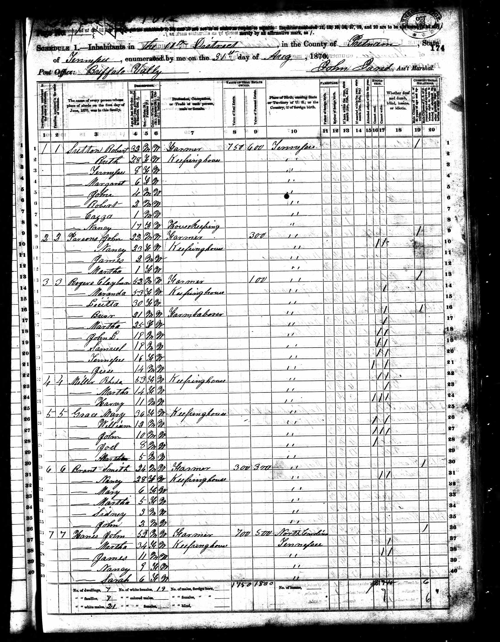 1710. “Ninth Census of the United States. Schedule No. 1.--Population,” Bureau of the Census, US Dept. of Commerce, United States of America, 1870, TN, Putnam, District 10, Buffalo Valley, August 31, 1870, John Jared, 174, 1.