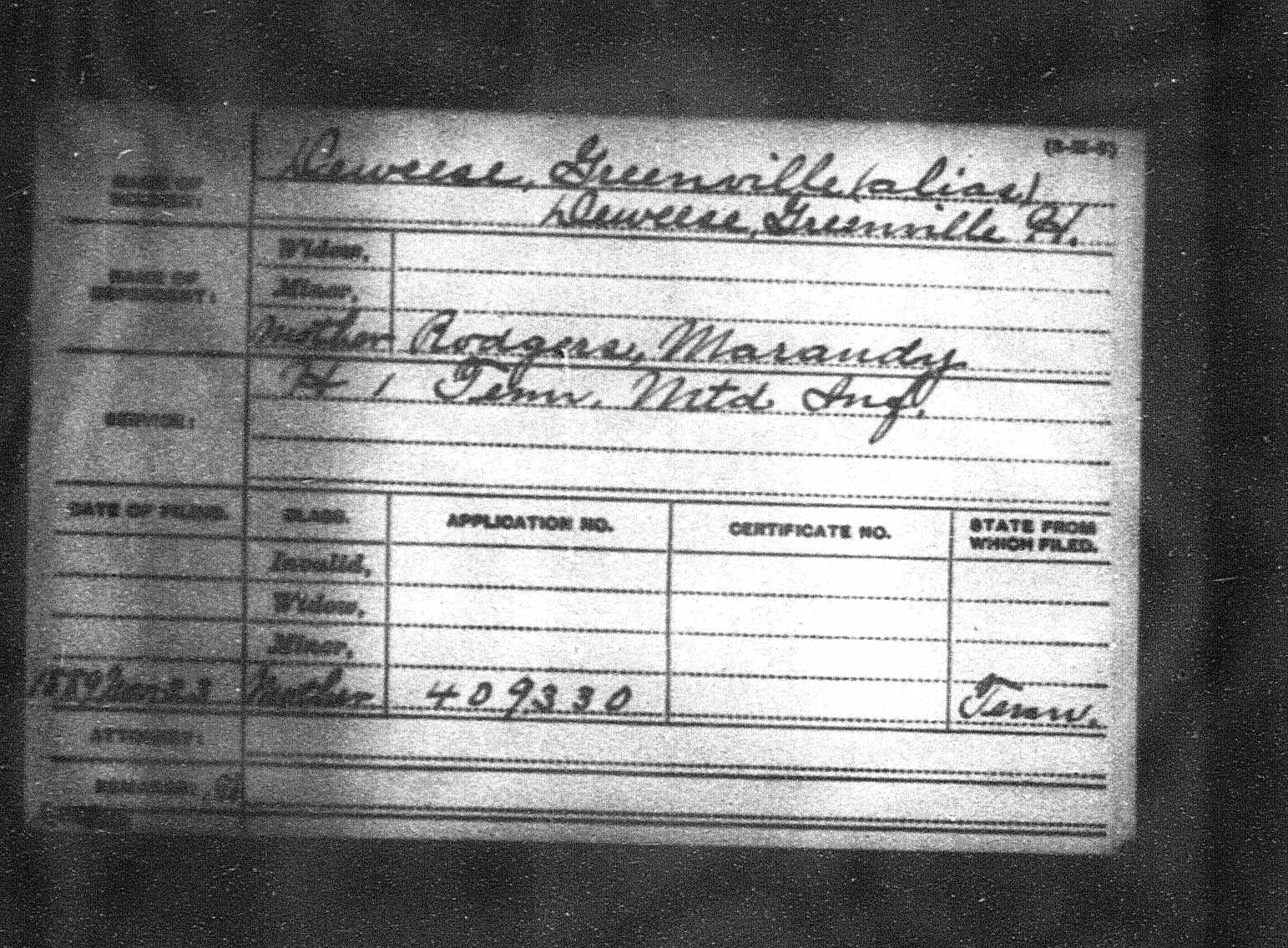 1726. Greenville H Deweese, “United States General Index to Pension Files, 1861-1934,” November 23, 1889, https://familysearch.org/ark:/61903/1:1:KDY6-FYT, His mother started receiving his pension after November 23, 1889 if I can read the card correct.y.