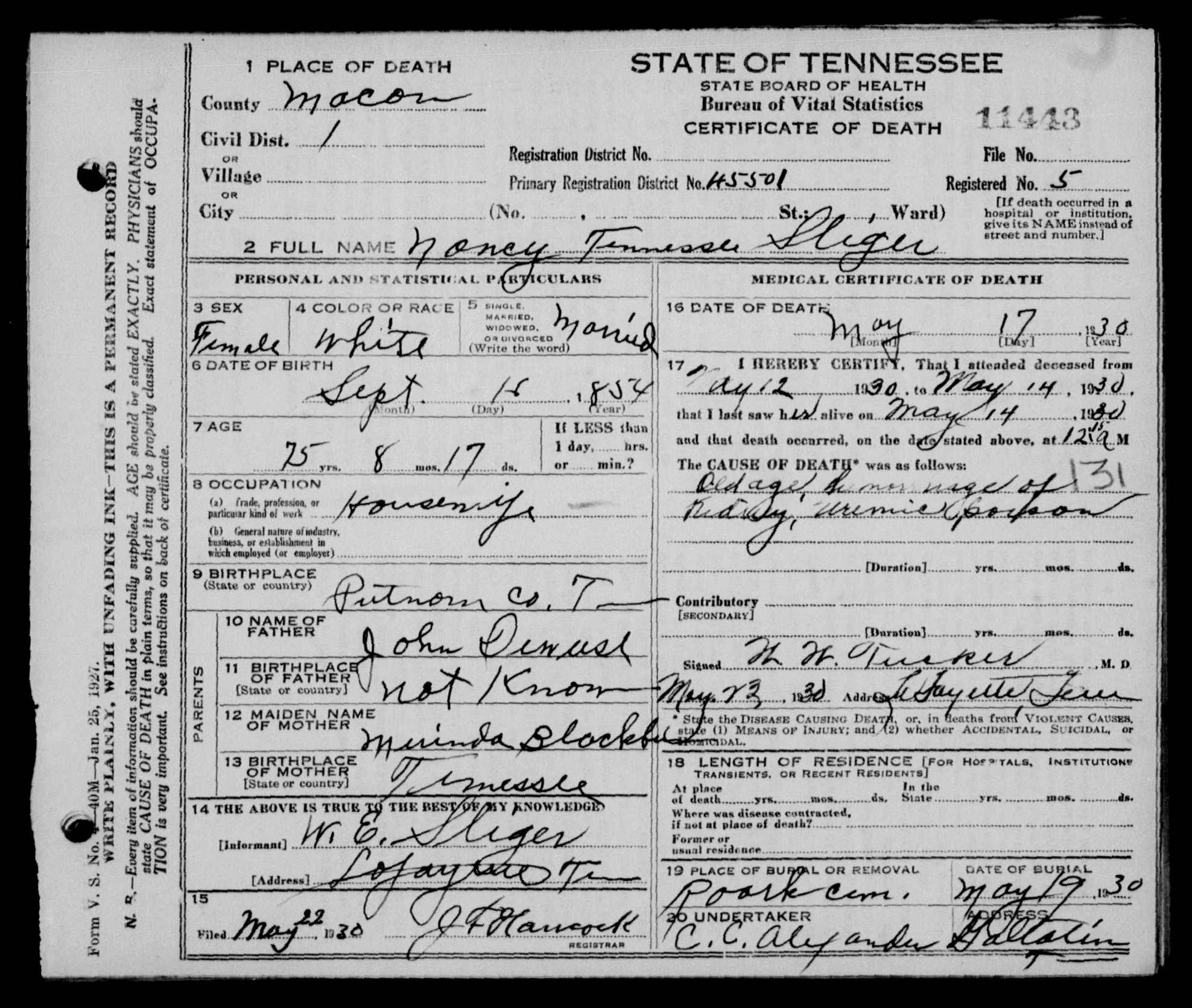 1744. Nancy Tennessee Sliger, “Tennessee Death Records, 1914-1955,” May 17, 1930, Macon County, TN, https://familysearch.org/ark:/61903/1:1:NSKF-LBQ.