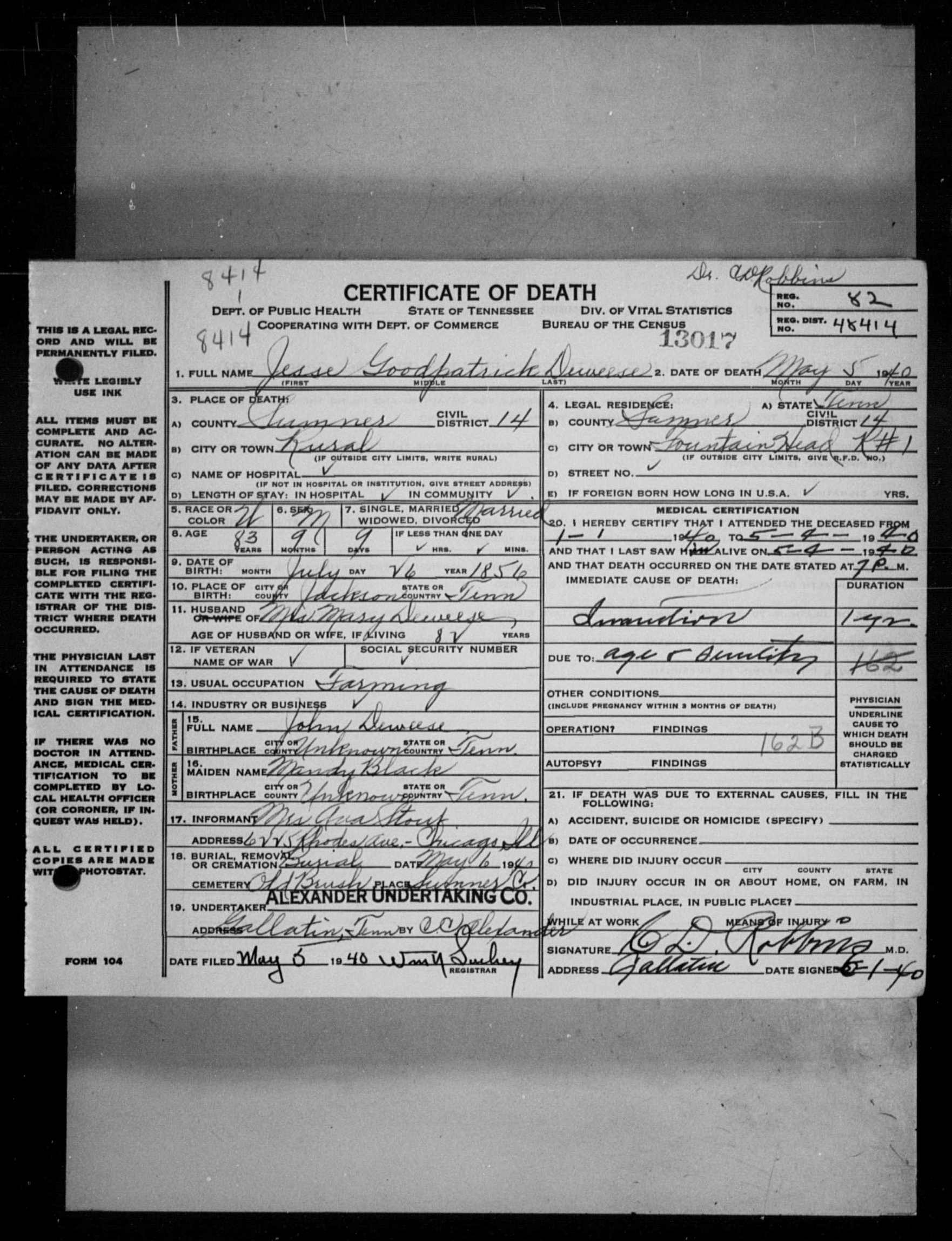 1749. Jesse Goodpatrick DeWeese, “Tennessee Death Records, 1914-1955,” microfilm, digital folder number: 4184453-image number: 593-film number: 1876888-volume/page/certificate number: cn 13017, https://familysearch.org/pal:/MM9.1.2/M149-LV1/p1.
