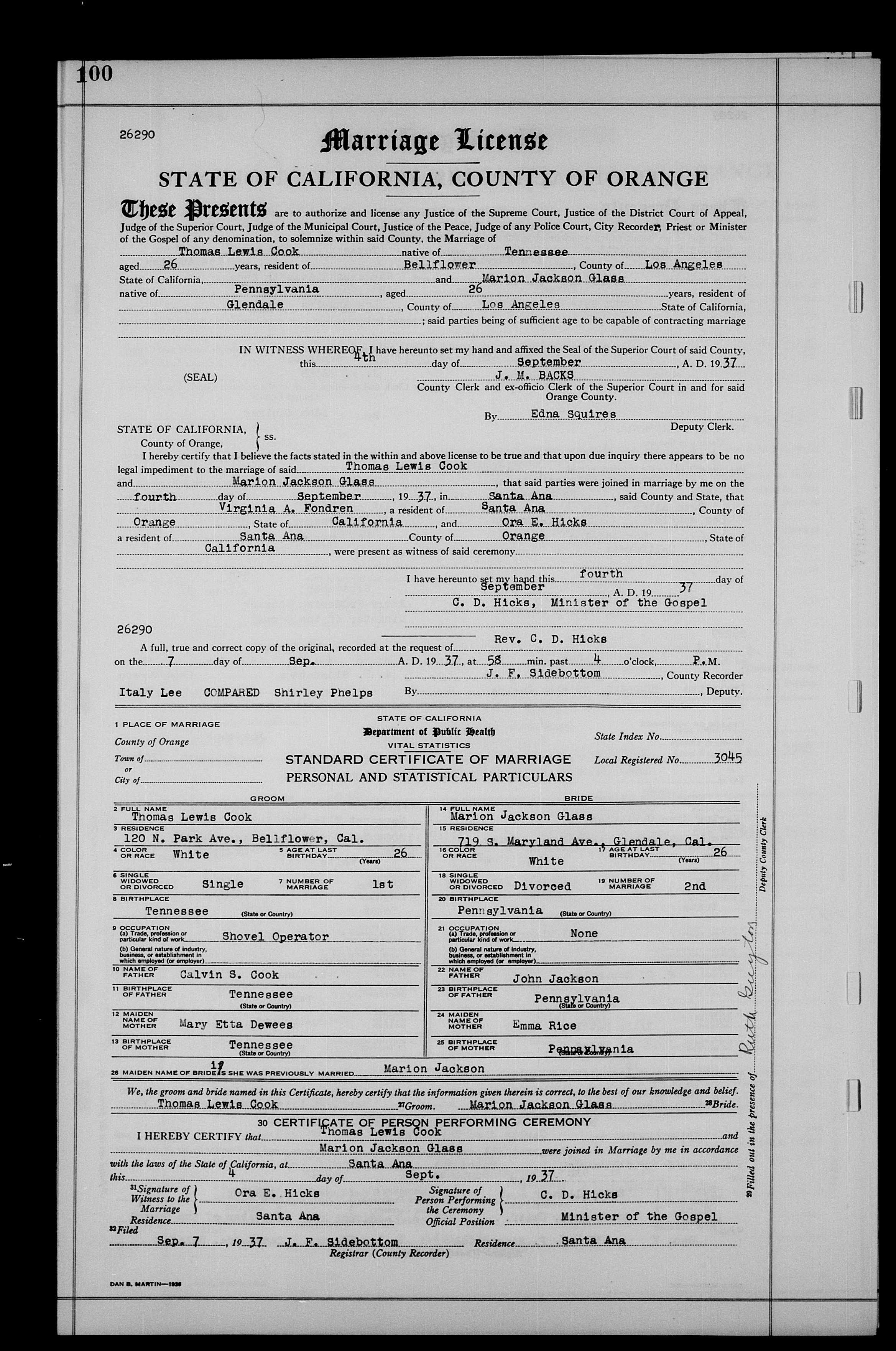 1842. “California, County Marriages, 1850-1952,” Thomas Lewis Cook and Marion Jackson Glass, September 4, 1937, Orange County, CA, USA, 26290, Page: 100-GS Film number: 2051142-Digital Folder Number: 005698349-Image Number: 00306, https://familysearch.org/pal:/MM9.1.1/K8FJ-SVT.