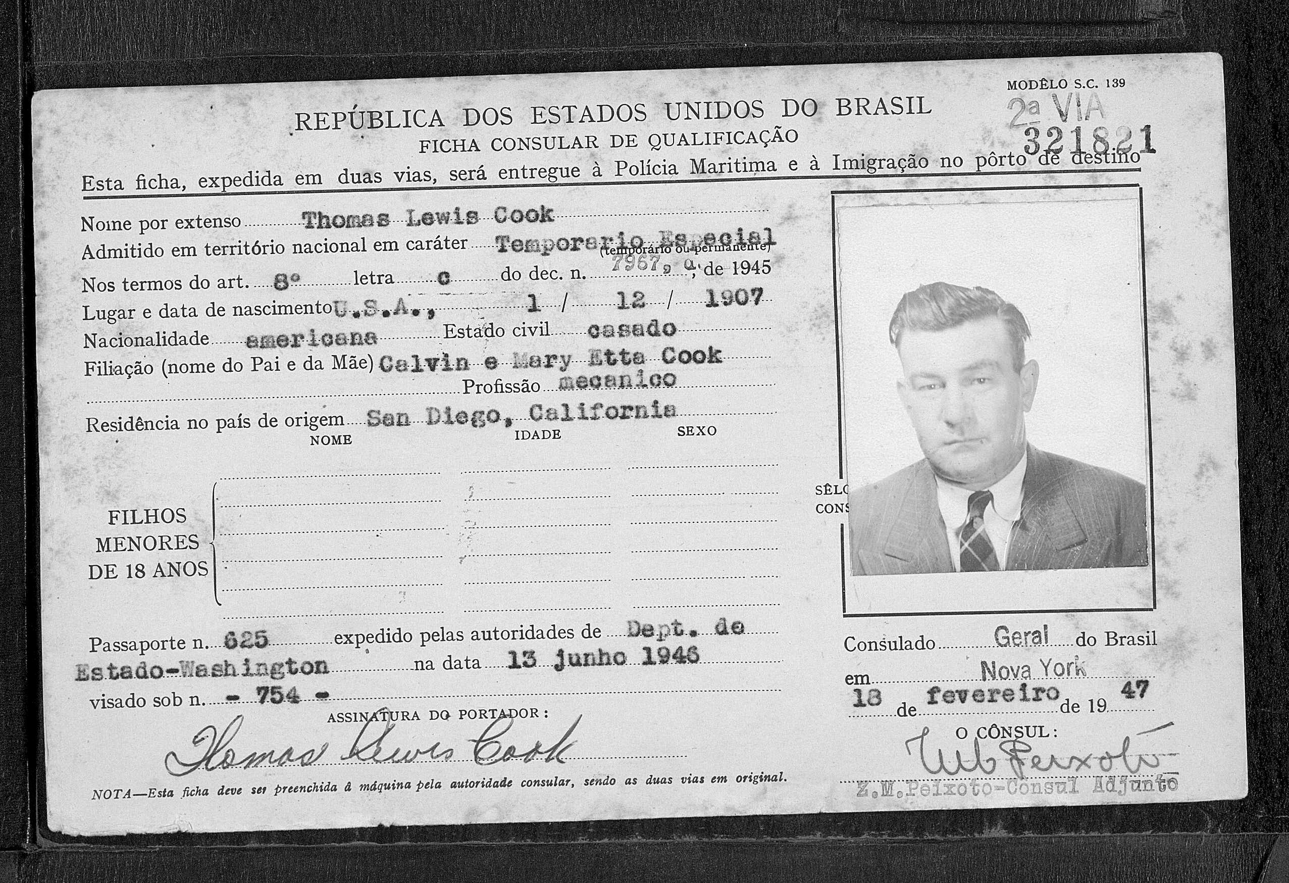1838. “Brazil, Rio de Janeiro, Immigration Cards, 1900-1965,” Thomas Lewis Cook, February 18, 1947, Digital Folder Number: 004910875-Image Number: 00122, https://familysearch.org/pal:/MM9.1.1/K692-PR8.