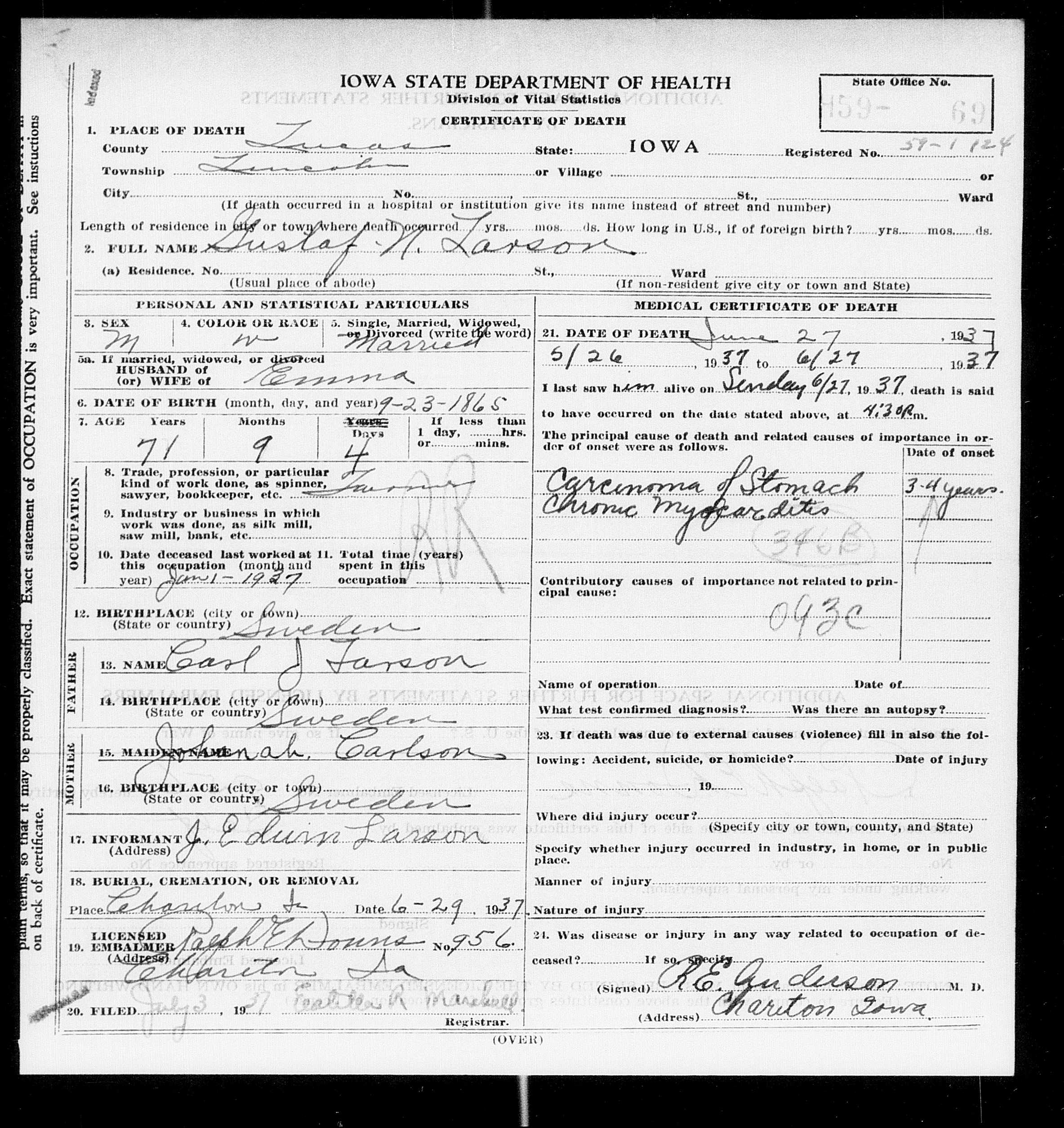 2058. Gustaf N Larson, “Iowa, Death Records, 1921-1940,” June 27, 1937, Lincoln, Lucas County, IA, https://familysearch.org/ark:/61903/1:1:Q24D-DH5T.
