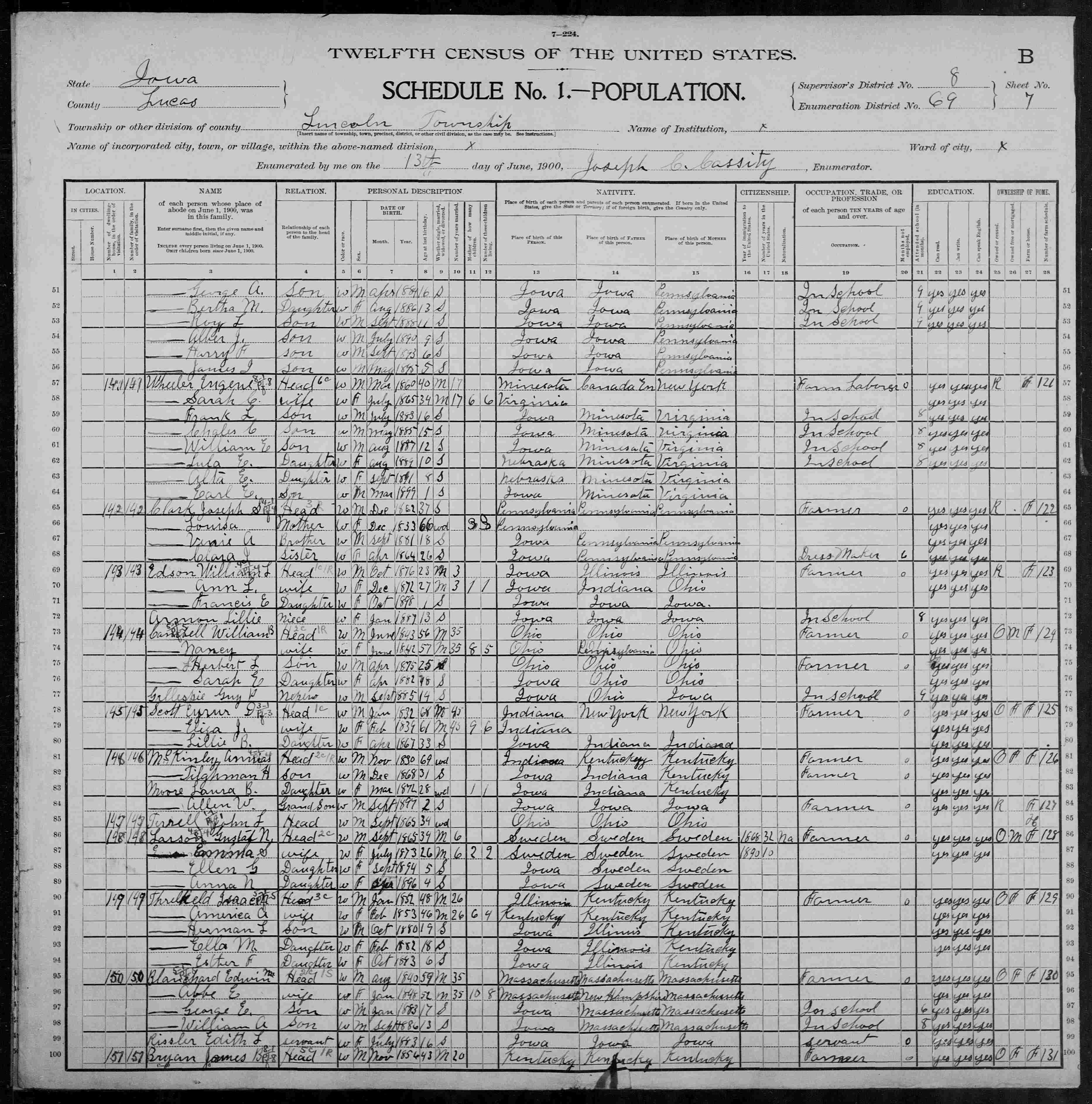 2062. “United States Census,” 1900, IA, Lucas, Lincoln, 7B, 8, 69, T623, 1240445, 103, Bureau of the Census, US Dept. of Commerce, United States of America, June 13, 1900, Joseph C Cassity.