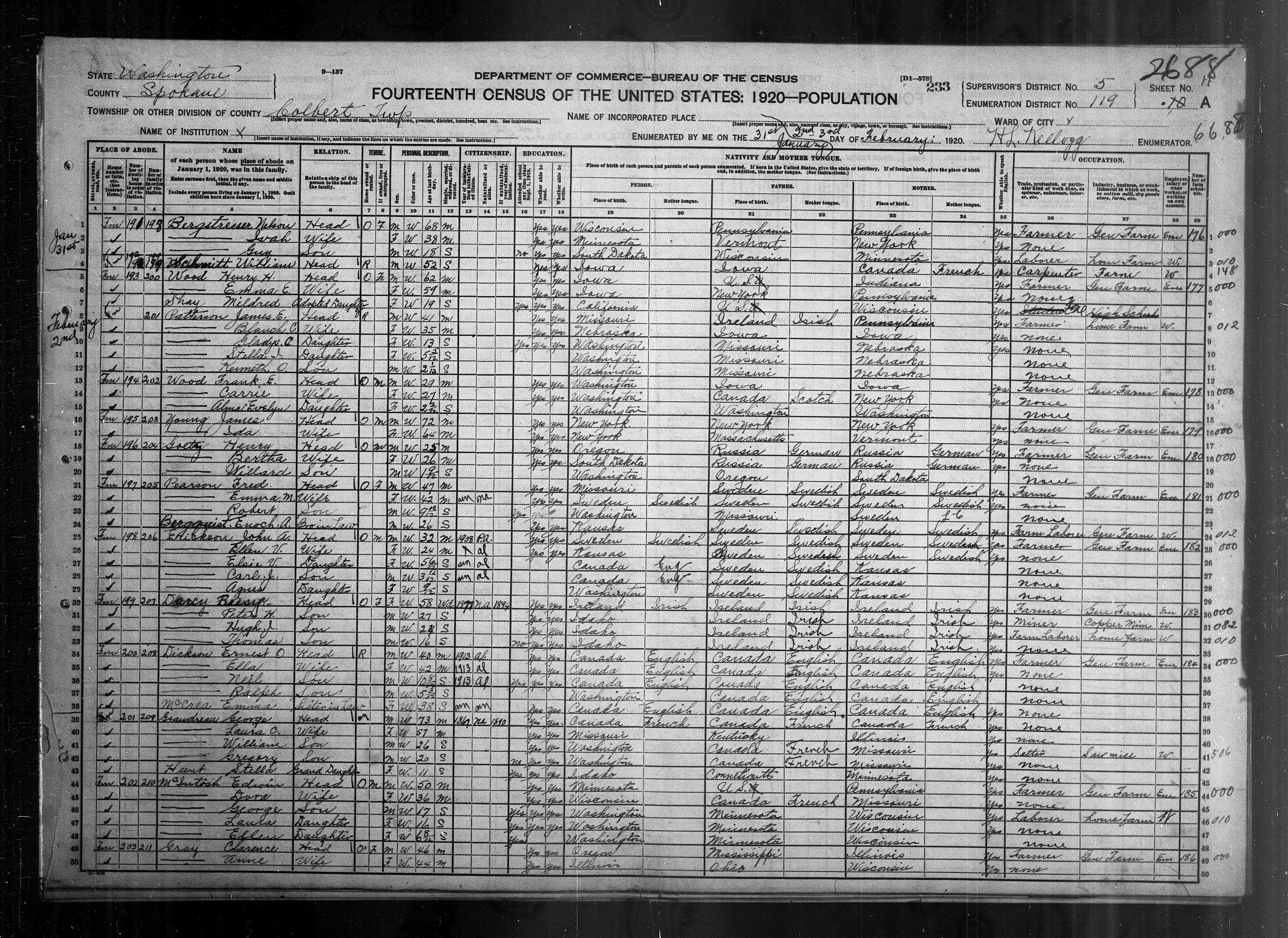 2076. “United States Census,” 1920, WA, Spokane, Colbert, 10A, 5, 119, T625, 1939, 2688, 1051, Bureau of the Census, US Dept. of Commerce, United States of America, February 2, 1920, H L Kellogg, Gives middle initial as M and lists Enoch A Bergquist as her brother.