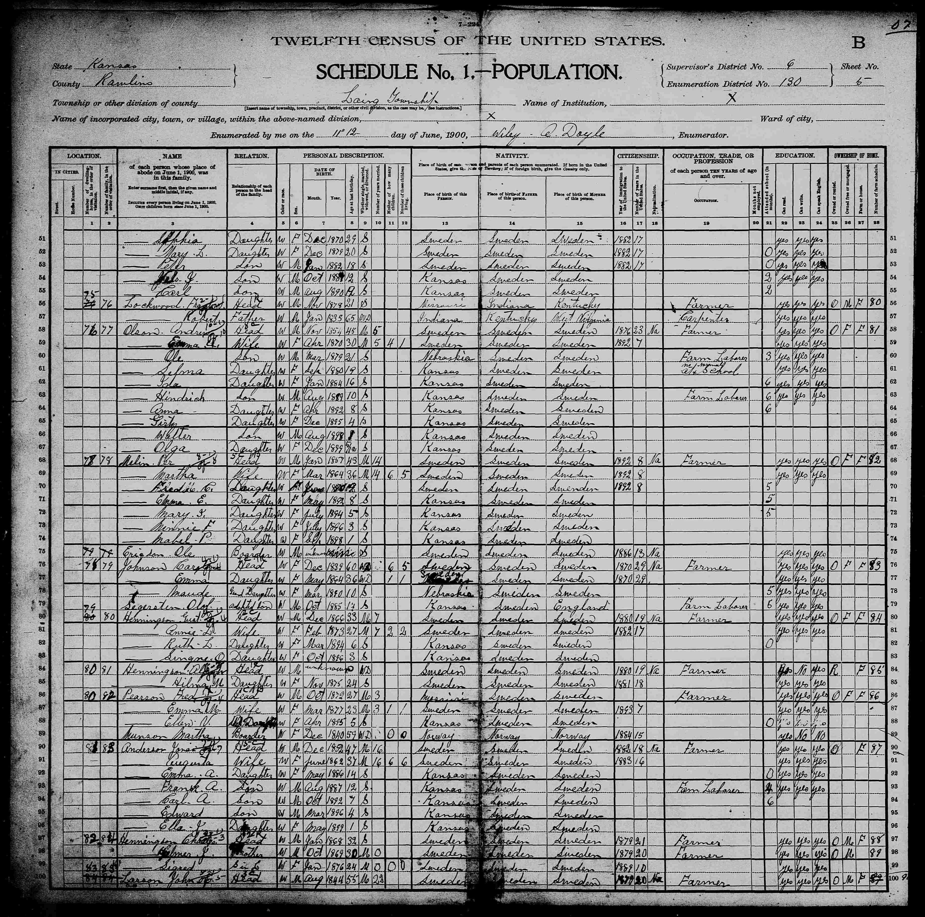 2077. “United States Census,” 1900, KS, Rawlins, Laing, 5B, 6, 130, T624, 1240496, 07, 74, Bureau of the Census, US Dept. of Commerce, United States of America, June 12, 1900, Wiley A Doyle.