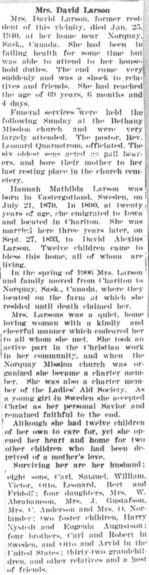 2094. “Obituaries,” Mrs. David Larson, Chariton Leader, Chariton, Lucas County, IA, February 20, 1940.