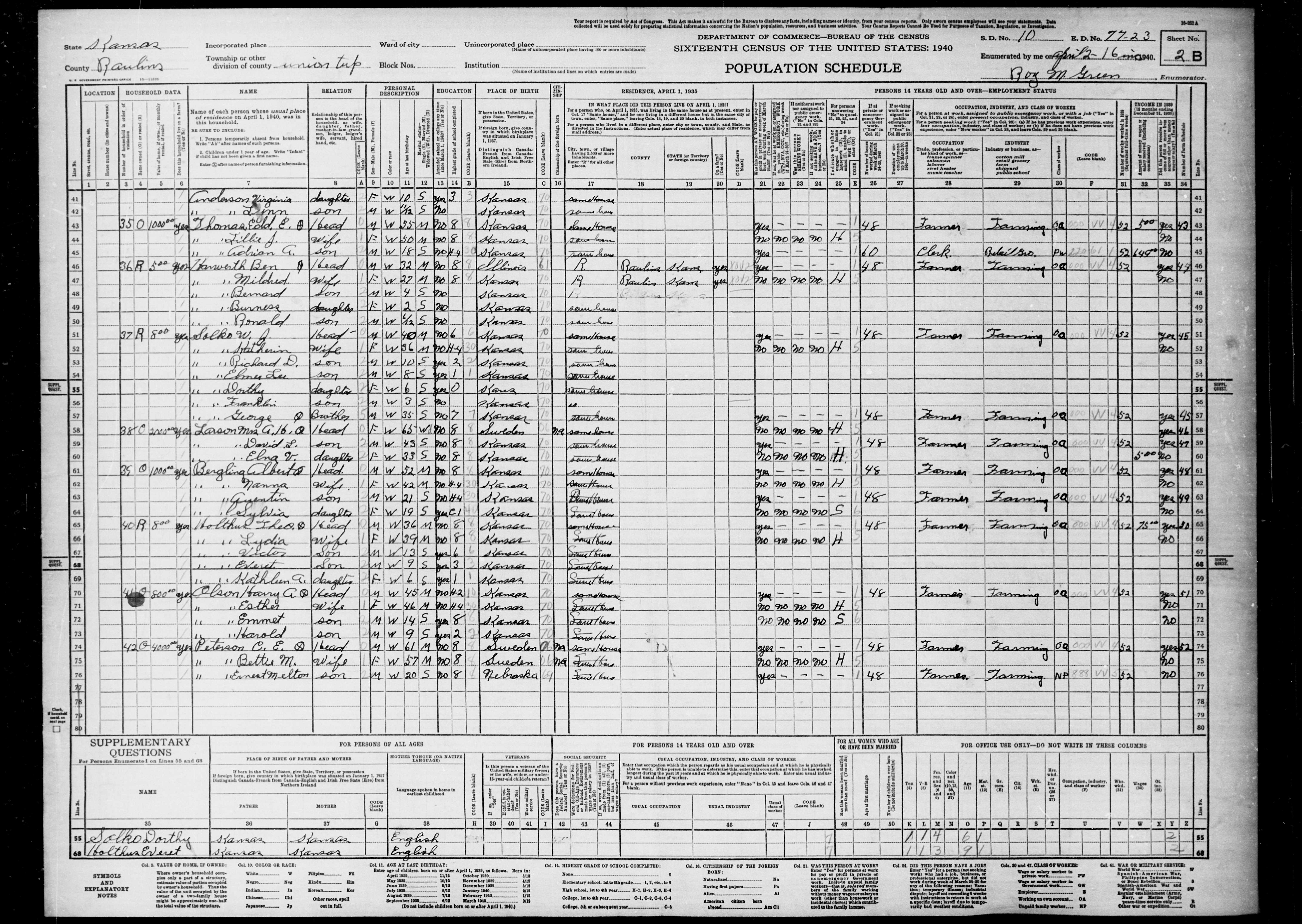2167. “United States Census: 1940,” Bureau of the Census, US Dept. of Commerce, United States of America, 1940, KS, Rawlins, Union, April 2-16, 1940, Roy M. Green, 2B, 10, 77-23, T627, 1252, 1062.