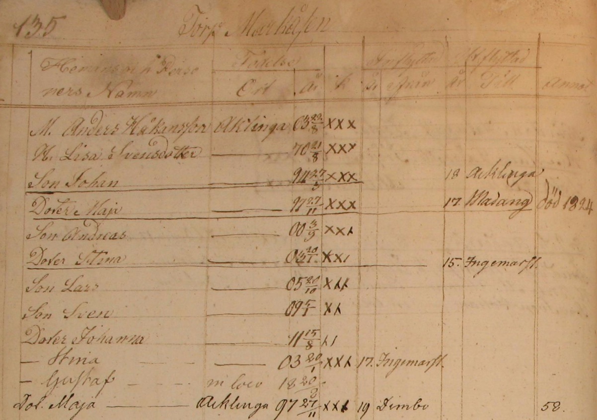 2179. “Sweden Household Examination Books,” 1815-1820, Agnetorp AI 4 1815-1820, Agnetorp Parish, Skaraborgs County, Västergötland, Sweden, Scandinavia, Markåsen, 135, 75.