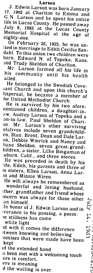 Survivors include two sons, Edwin of Zaire, Africa, and Willard of Oberlin; a daughter, Geneva Christensen of Zaire, Africa; a brother, Elder Carlson of Oberlin; a sister, Clara Swisher of Payson, Ariz.; nine grandchildren; and nine great-grandchildren.