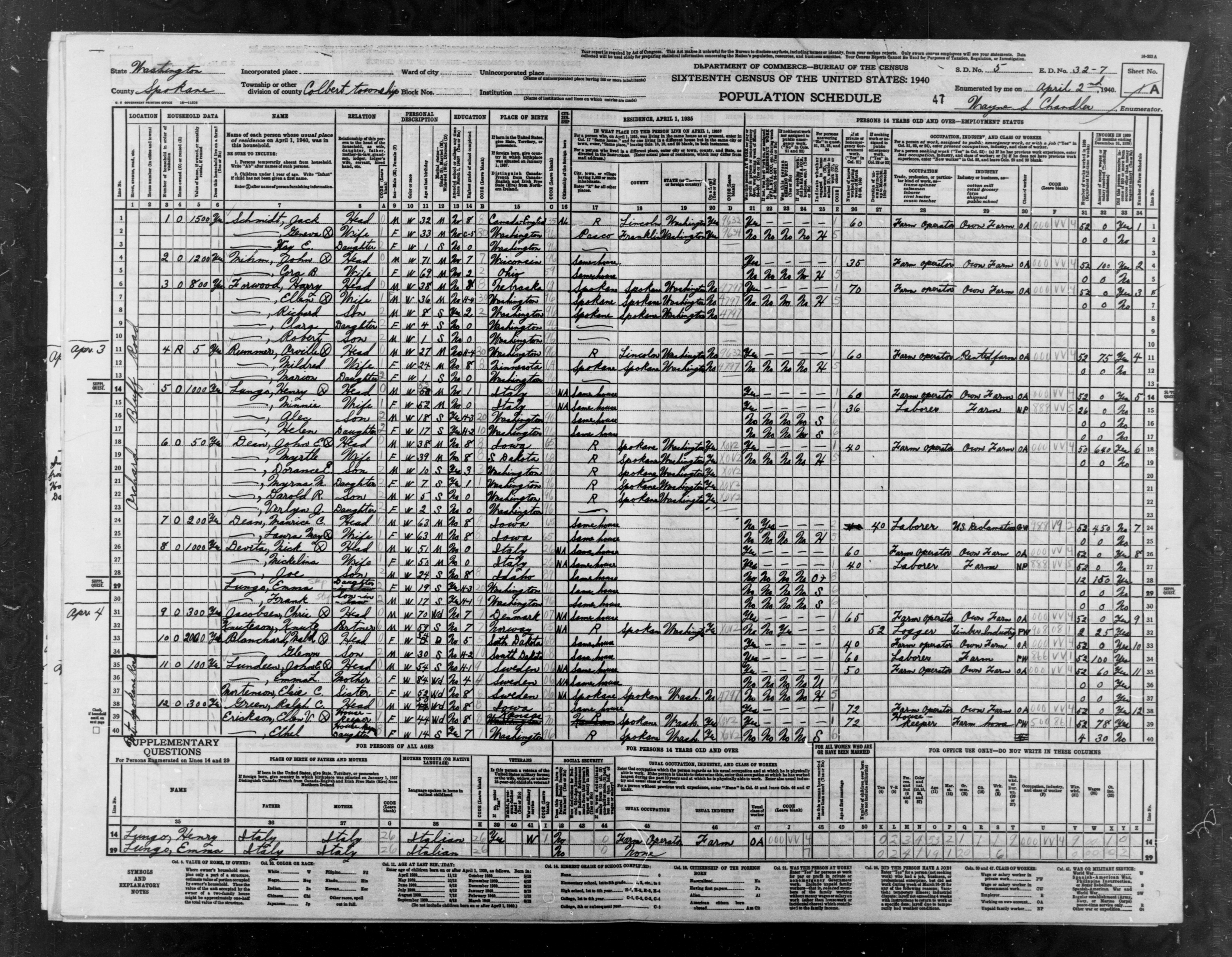 2217. “United States Census,” 1940, WA, Spokane, Colbert, 1A, 5, 32-7, T627, 04362, 106, Bureau of the Census, US Dept. of Commerce, United States of America, April 2, 1940, Wayne S Chandler.