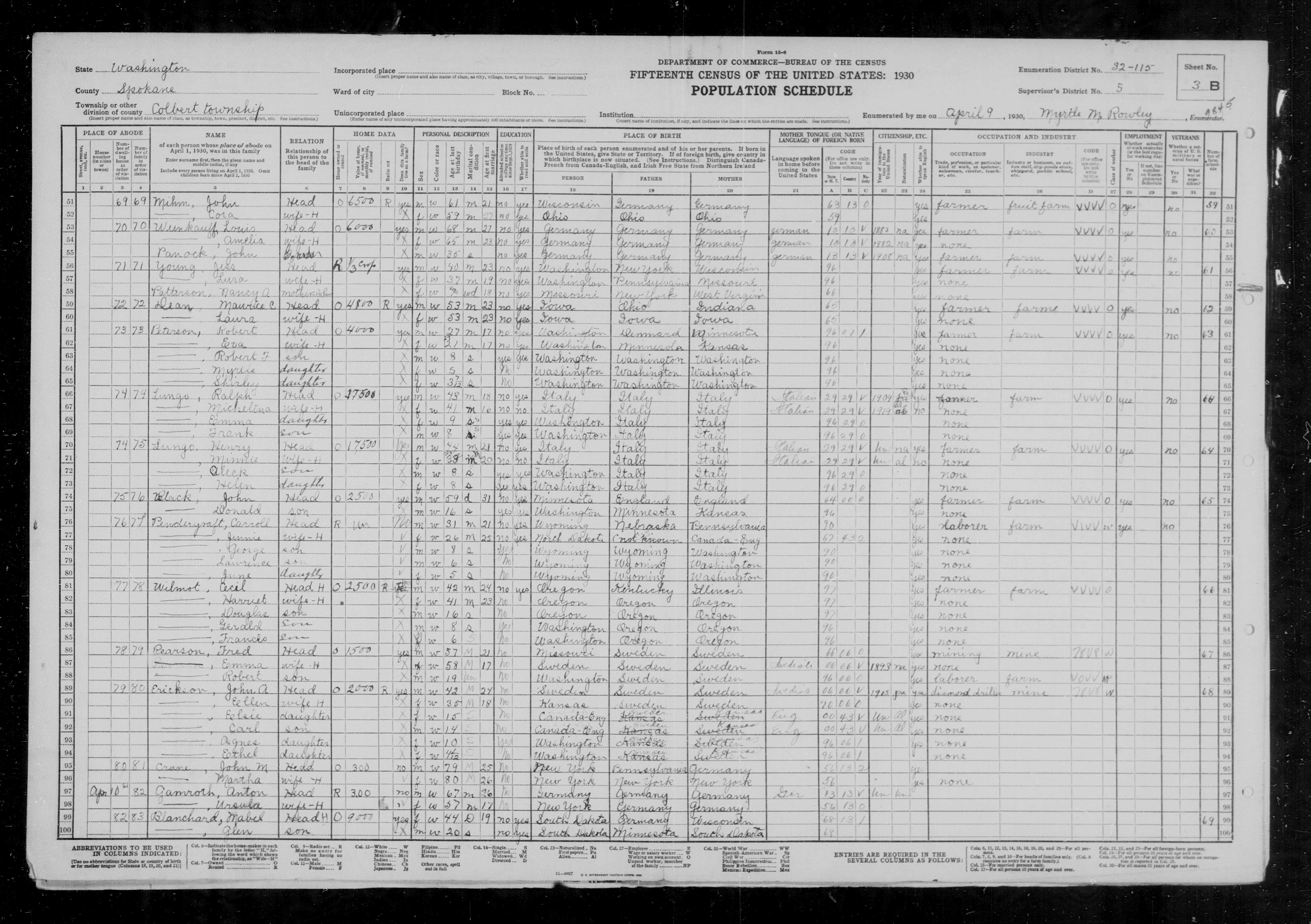2221. “United States Census,” 1930, WA, Spokane, Colbert, 3B, 5, 32-115, T626, 2513, 9845, 905, Bureau of the Census, US Dept. of Commerce, United States of America, April 9, 1930, Myrtle M Rowley.