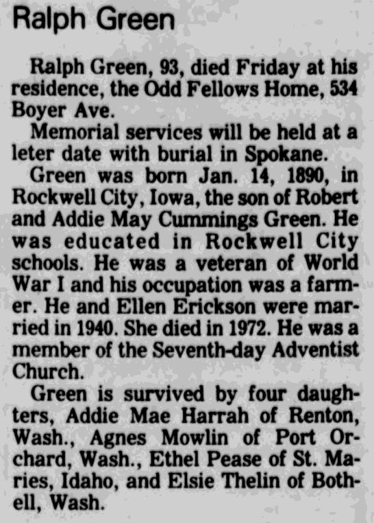 2229. “Obituaries,” Ralph Green, Walla Walla Union Bulletin, Walla Walla, WA, December 18, 1983, 3.