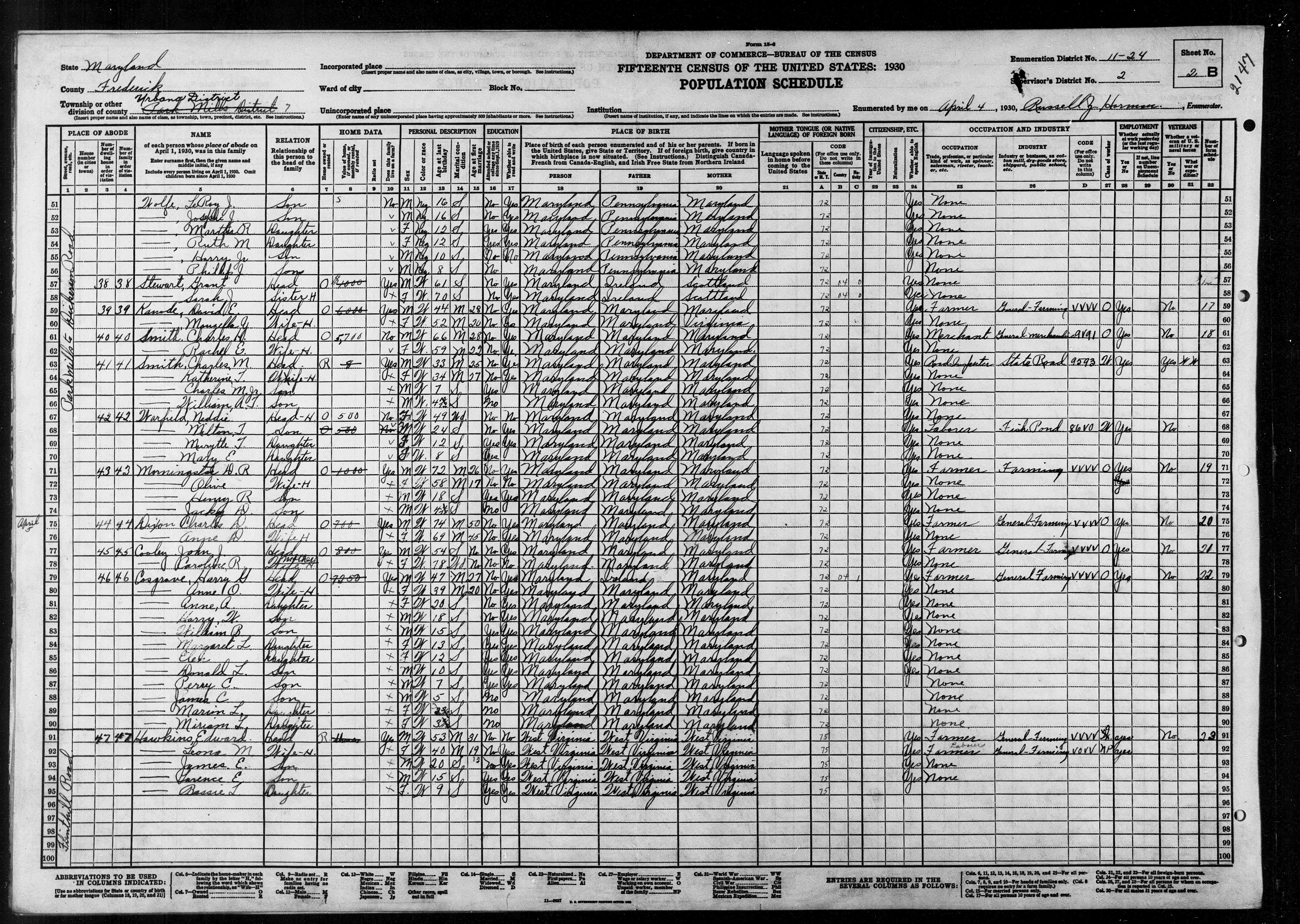 2401. “United States Census,” 1930, MD, Frederick, Urbana, 2B, 2, 11-24, T62619, 874, 568, Bureau of the Census, US Dept. of Commerce, United States of America, April 4, 1930, Russell Z Harman.