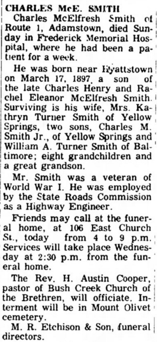 2403. “Deaths,” Charles McElfresh Smith, The News, Frederick, MD, December 26, 1967, 2.