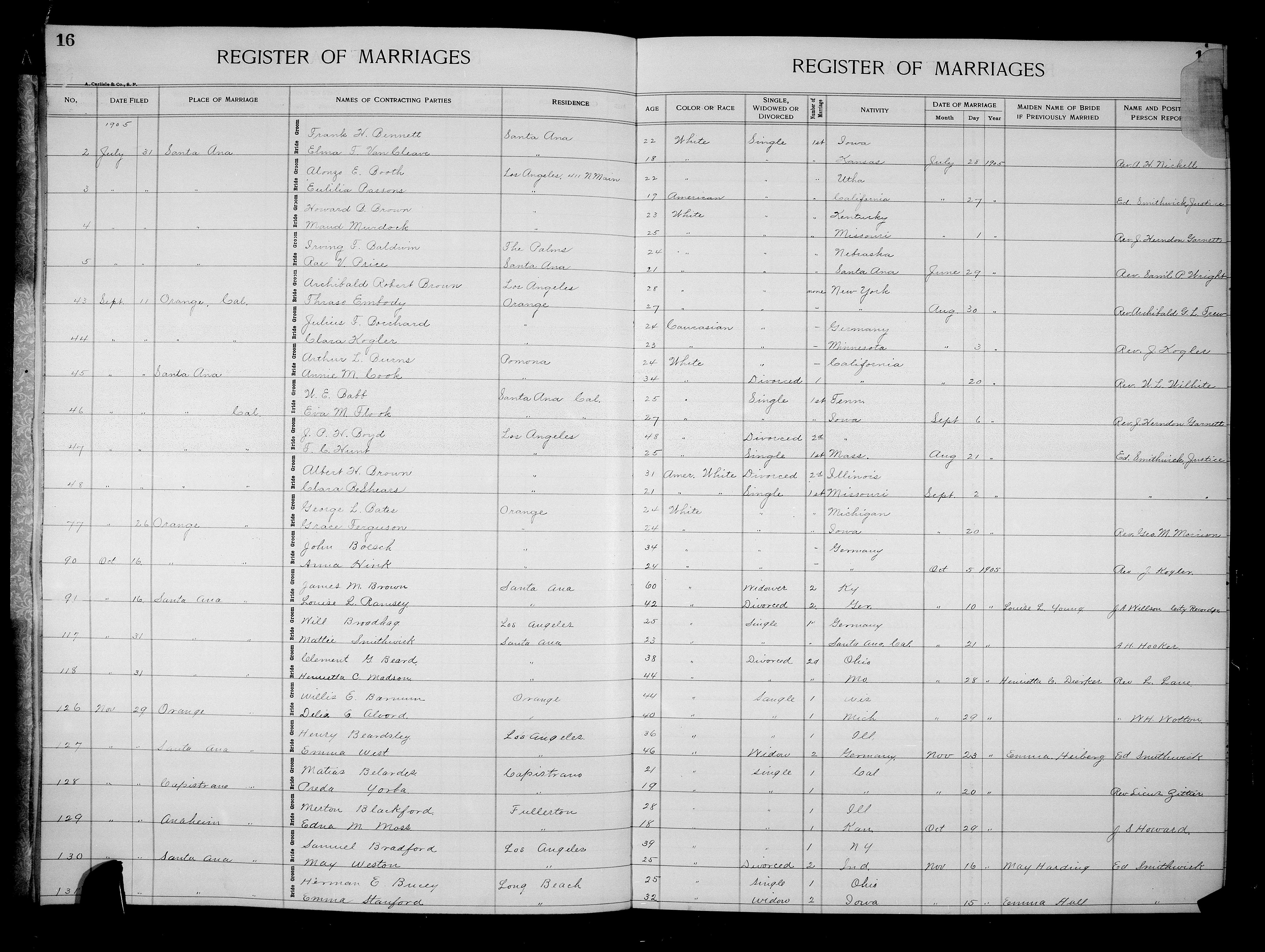 2443. Clement G Beard and Henrietta C Madson, “California, County Marriages, 1850-1952,” October 28, 1905, Santa Ana, Orange County, CA, https://familysearch.org/ark:/61903/1:1:K8XR-YZJ.