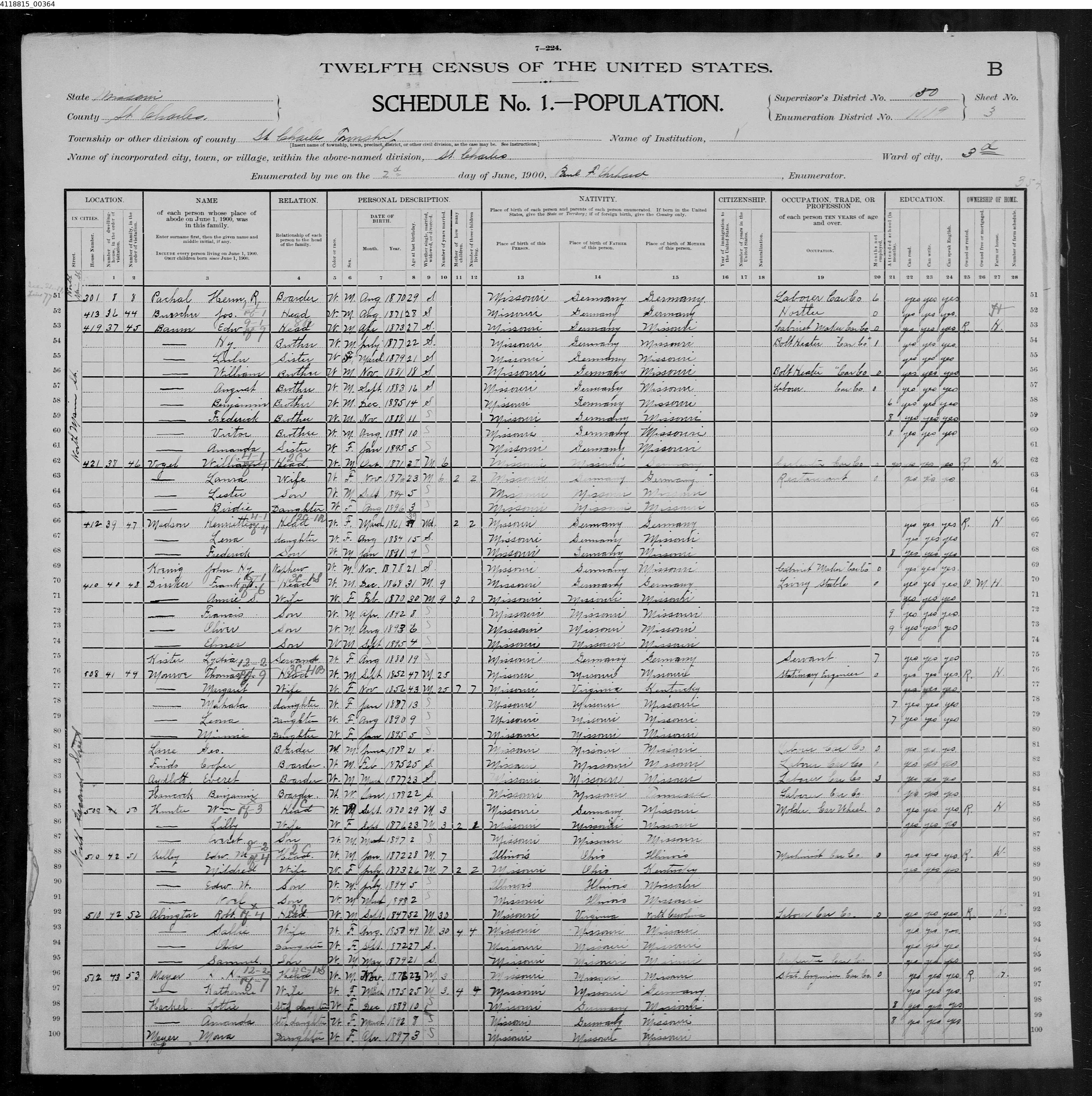 2448. “United States Census,” 1900, MO, St Charles, St Charles, Ward 03, 3B, 50, 119, T623, 1240886, 364, Bureau of the Census, US Dept. of Commerce, United States of America, June 2, 1900, Paul F Ehshard.