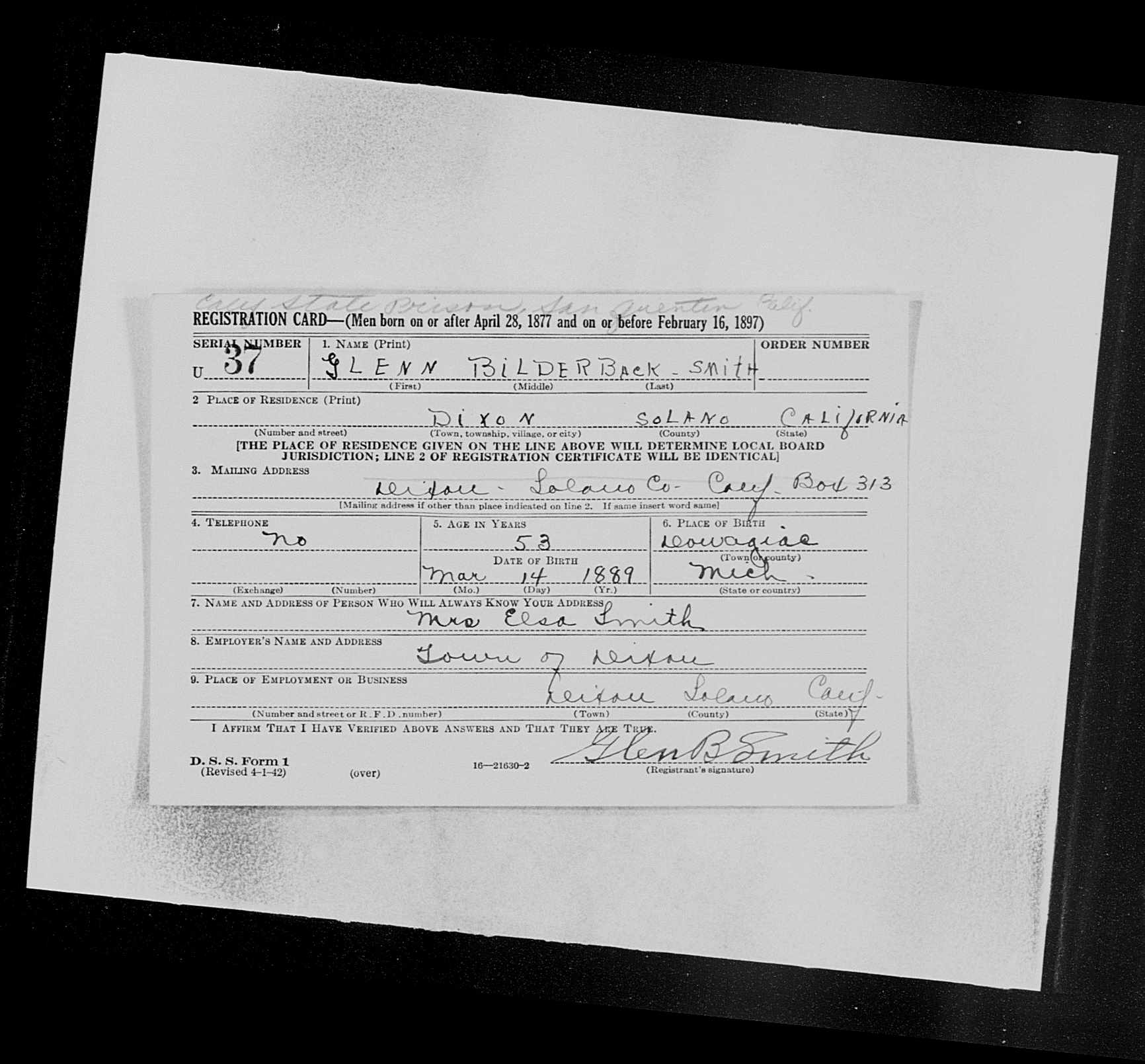 2609. World War II, 1942, California, U37, Smith, Glenn Bilderback, “World War II Draft Cards (4th Registration) for the State of California,” April 25, 1942, Fairfield, Solano County, CA, https://familysearch.org/pal:/MM9.1.1/V4DS-1XS, Record says March 14, 1889.