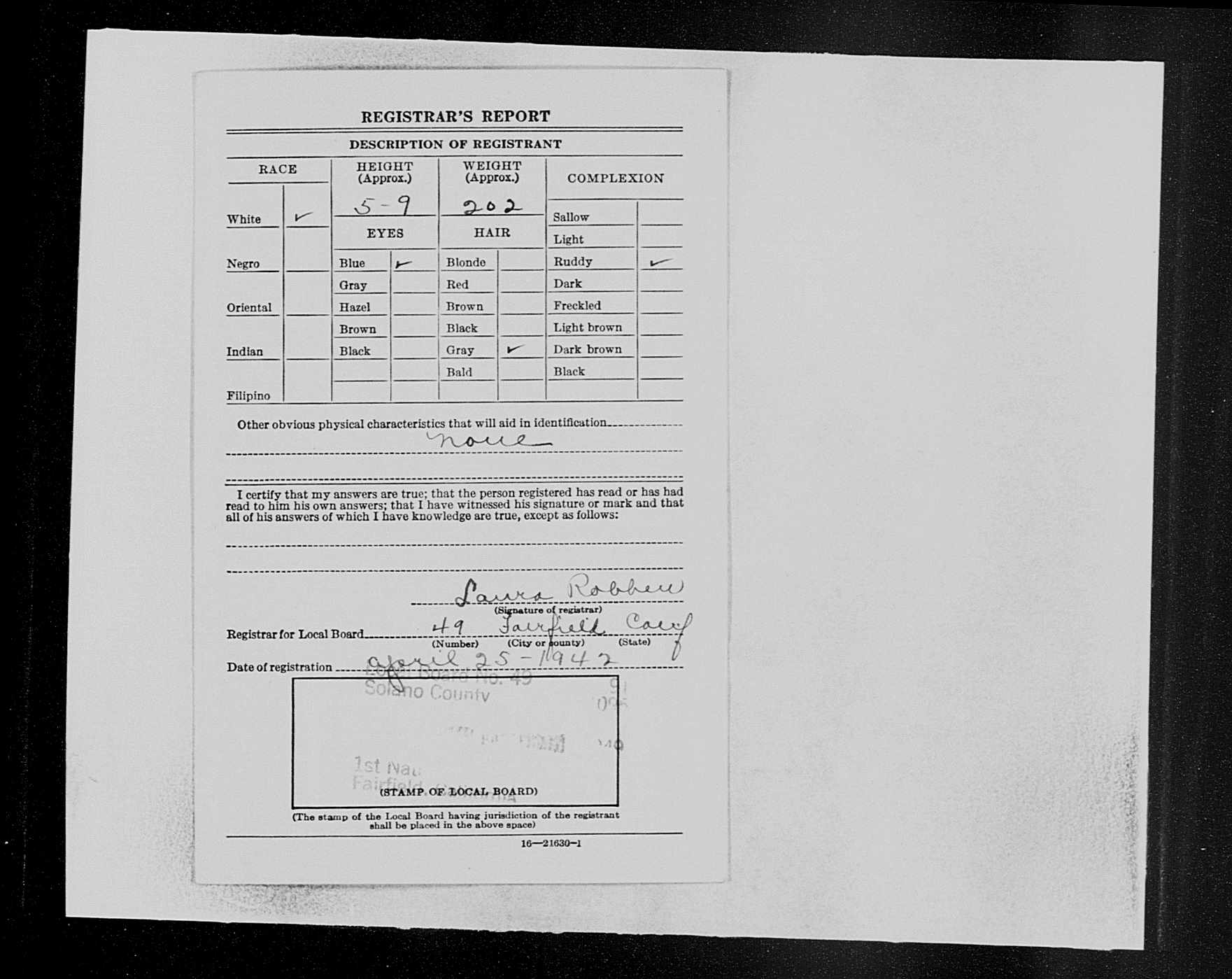 2604. World War II, 1942, California, U37, Smith, Glenn Bilderback, “World War II Draft Cards (4th Registration) for the State of California,” April 25, 1942, Fairfield, Solano County, CA, https://familysearch.org/pal:/MM9.1.1/V4DS-1XS.