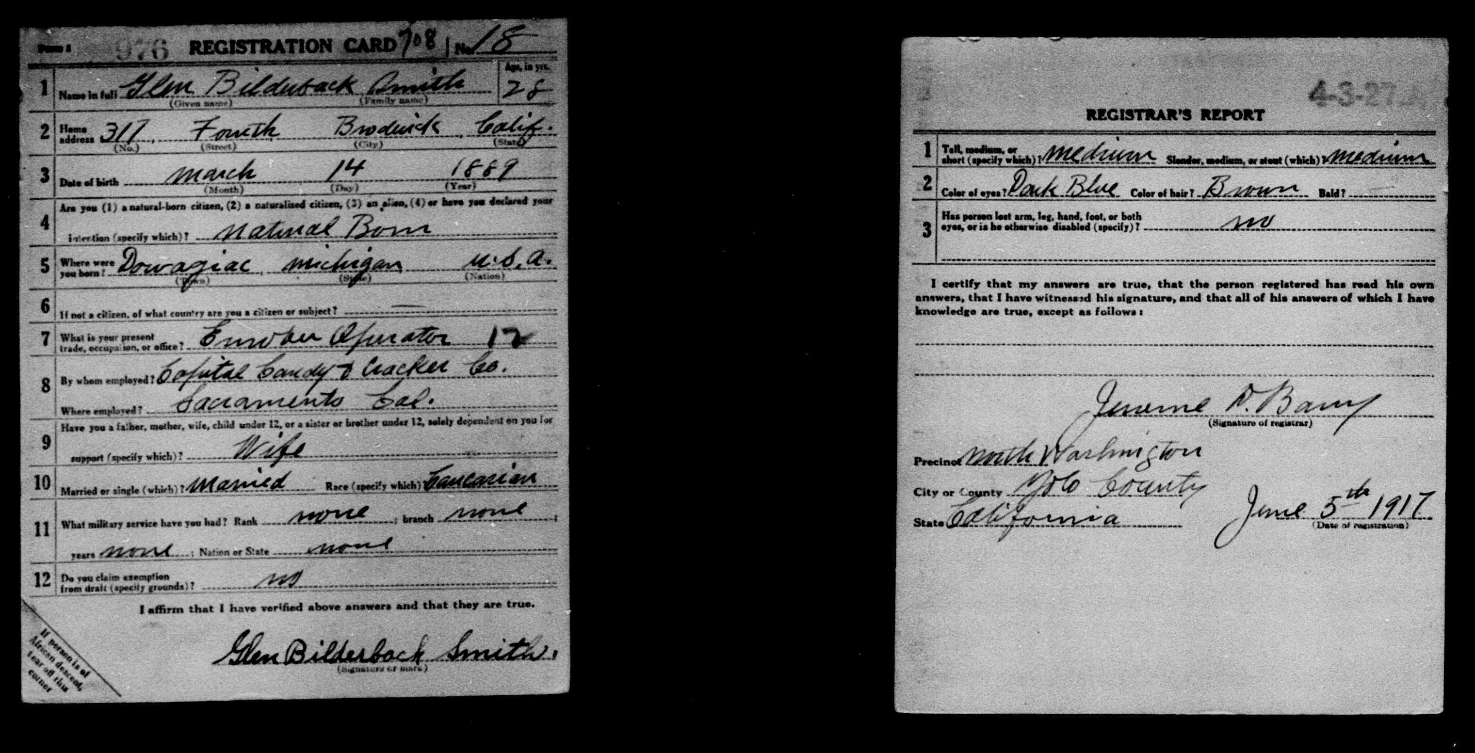 2608. World War I, 1917, California, 976, Smith, Glen Bilderback, “World War I Selective Service System Draft Registration Cards,” June 5, 1917, North Washington, Yolo County, CA, Affiliate Publication Number: M1509-GS Film number: 1544472-Digital Folder Number: 005241920-Image Number: 03777, https://familysearch.org/pal:/MM9.1.1/KZKZ-HKW, Record says March 14, 1889.