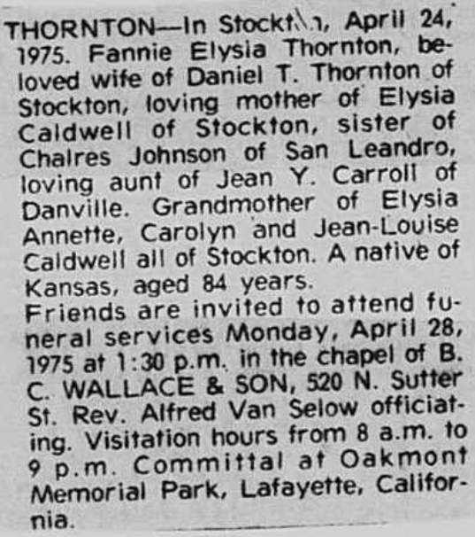 Thornton--In Stockton, April 24, 1975. Fannie Elysia Thornton, beloved wife of Daniel T. Thorton of Stockton, loving mother of Elysia Caldwell of Stockton, sister of Chalres (sic) Johnson of San Leandro, loving aunt of Jean Y. Carroll of Danville. Grandmother of Elysia Annette, Carolyn and Jean-Louise Caldwell all of Stockton. A native of Kansas, aged 84 years.