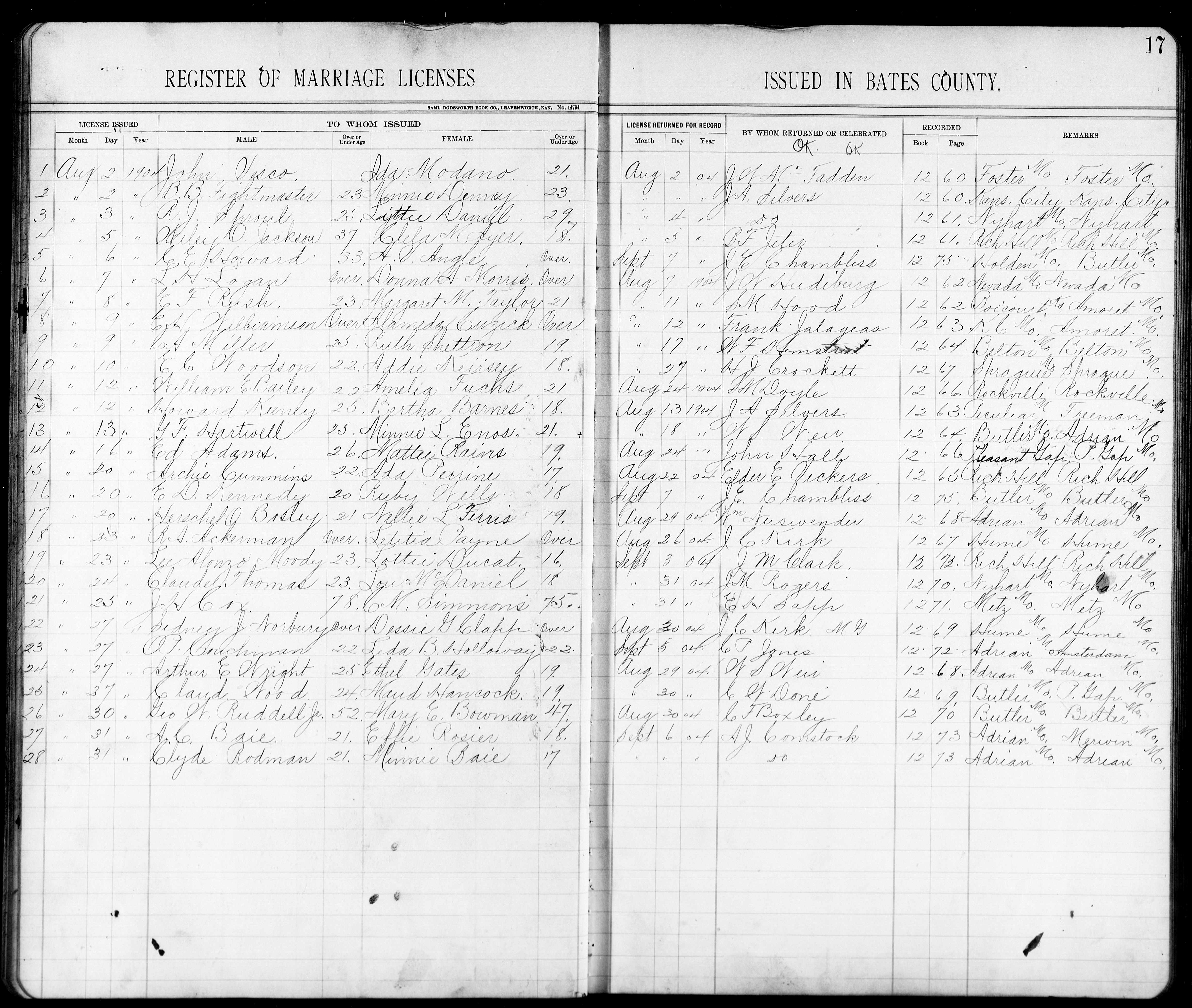2718. O P Couchman and Lida B Holloway, “Missouri, County Marriage, Naturalization, and Court Records, 1802-1969,” August 27, 1904, Bates County, MO, USA, Digital Folder Number: 007173490 , Image Number: 00445, https://familysearch.org/pal:/MM9.1.1/2CC4-9J4, Line 23: License issued August 27, 1904 and returned September 5, 1904.