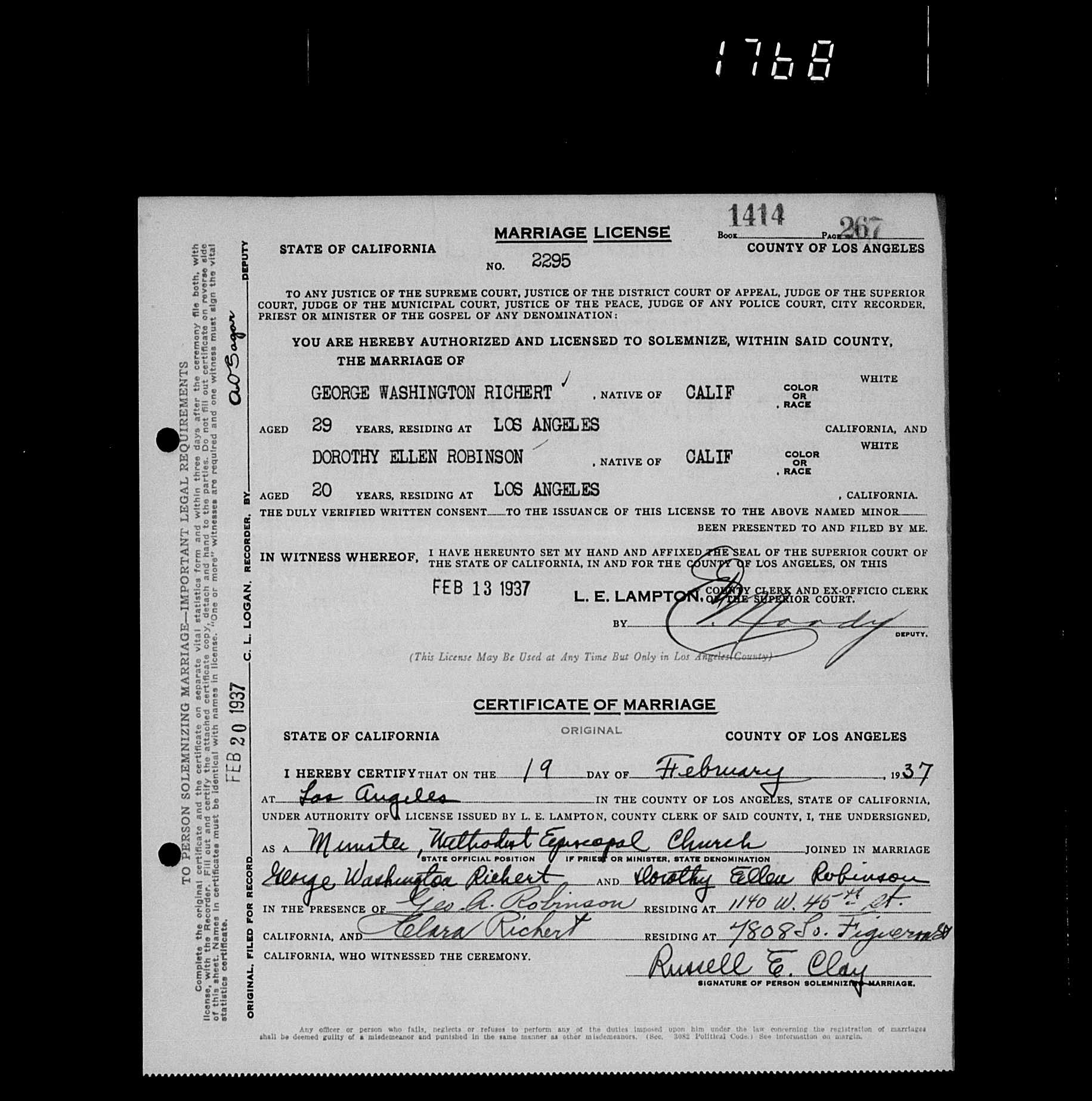 2722. “California, County Marriages, 1850-1952,” George Washington Richert and Dorothy Ellen Robinson, February 19, 1937, Los Angeles, Los Angeles County, CA, USA, Page: 267-GS Film number: 2114001-Digital Folder Number: 005698594-Image Number: 01755, https://familysearch.org/pal:/MM9.1.1/K8JY-S1R.