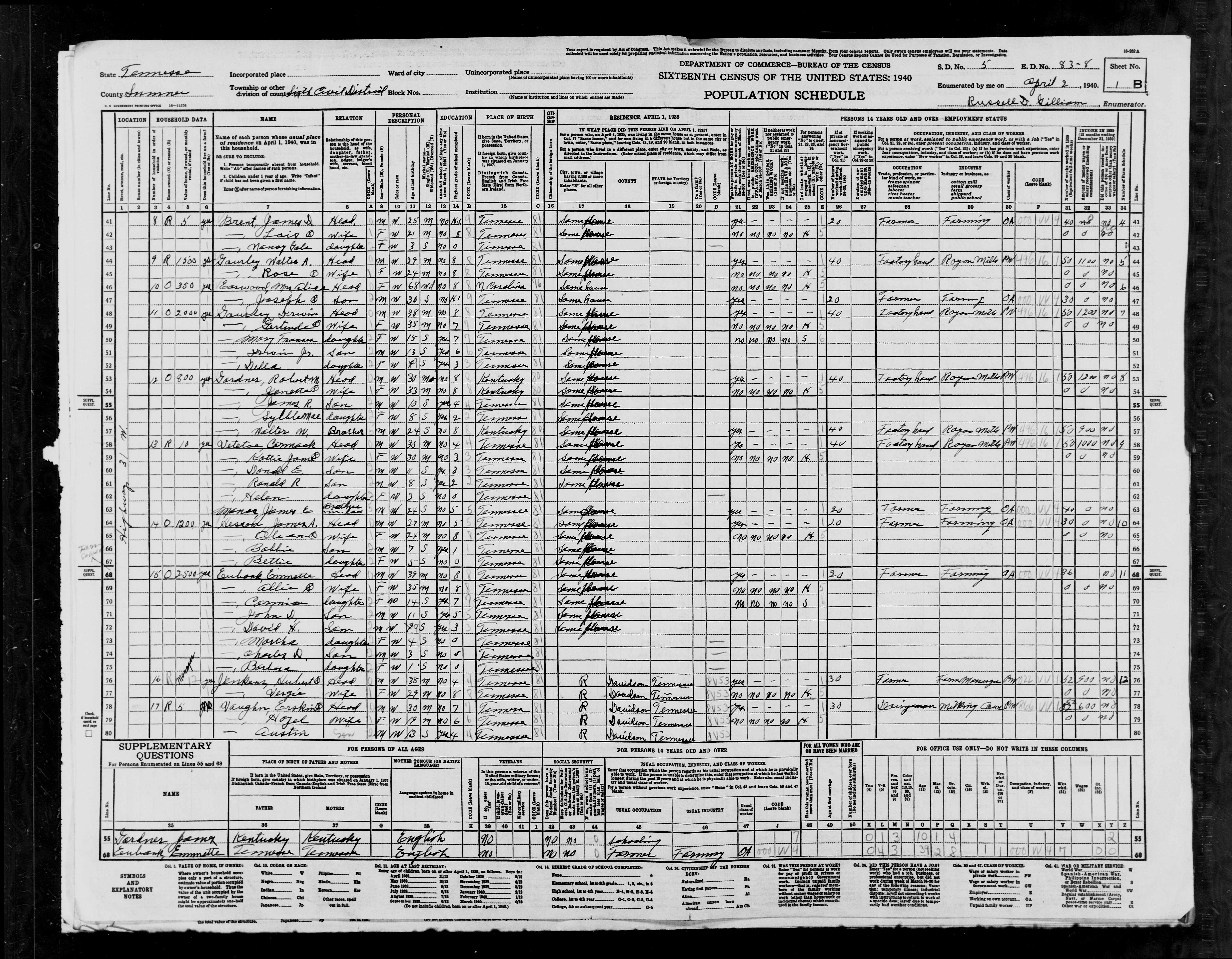 2893. “United States Census: 1940,” Bureau of the Census, US Dept. of Commerce, United States of America, 1940, TN, Sumner, Civil District 6, April 2, 1940, Russell D Gilliam, 1B, 5, 83-8, T627, 3939, 301.