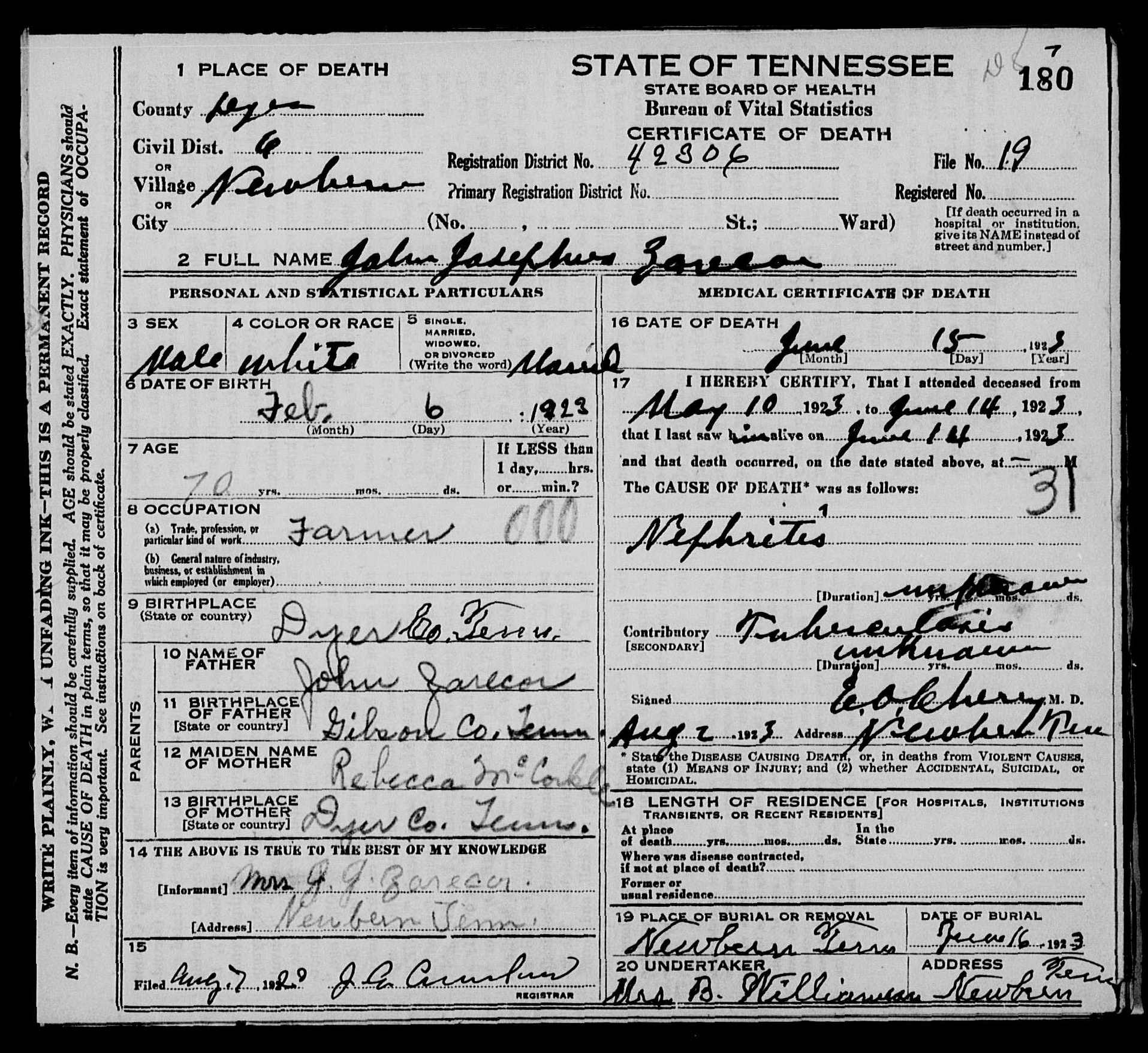 3017. John Josephus Zarecor, “Tennessee Death Records, 1914-1955,” microfilm, digital folder number: 4184096-image number: 1351-film number: 1299756-volume/page/certificate number: v 15 cn 180, https://familysearch.org/pal:/MM9.1.1/NSPS-6JV.