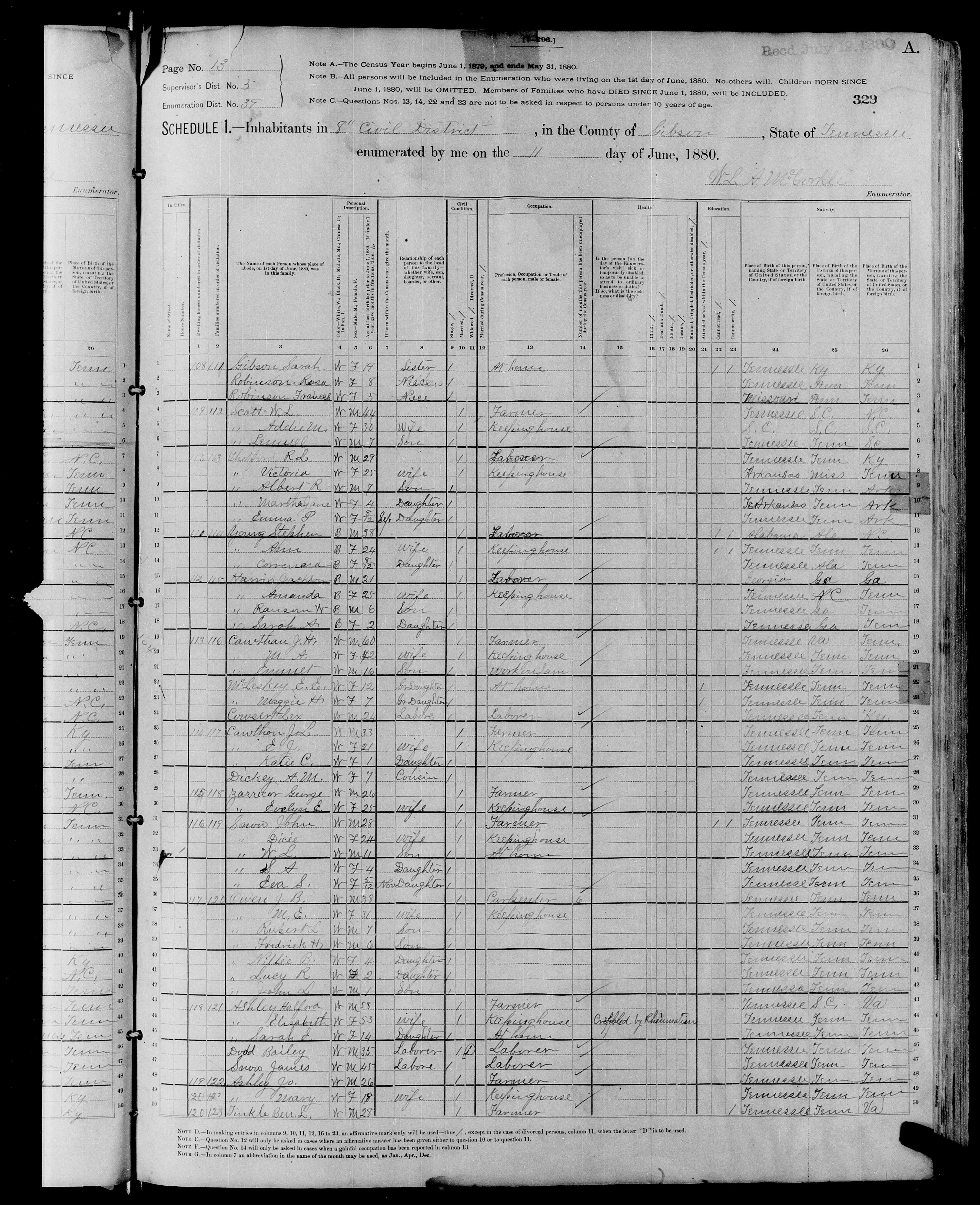 3011. “United States Census,” 1880, TN, Gibson, Yorkville, District 8, 13A, 5, 39, T9, 1255255, 329, 249, 10th Decennial Census Office, Bureau of the Census, US Dept. of Commerce, United States of America, June 11, 1880, W L A McCorkle.
