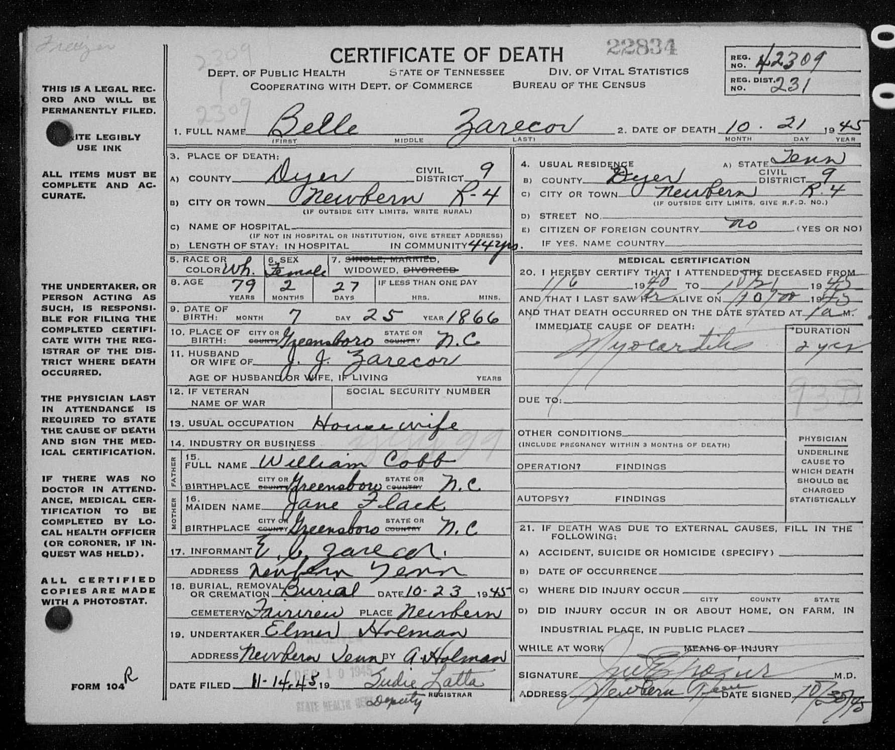 3025. Belle Zarecor, “Tennessee, Death Records, 1914-1955,” October 21, 1945, microfilm, digital folder number: 4184904-image number: 386-film number: 2137364-volume/page/certificate number: cn 22834, https://familysearch.org/pal:/MM9.1.1/NSWW-K4M.