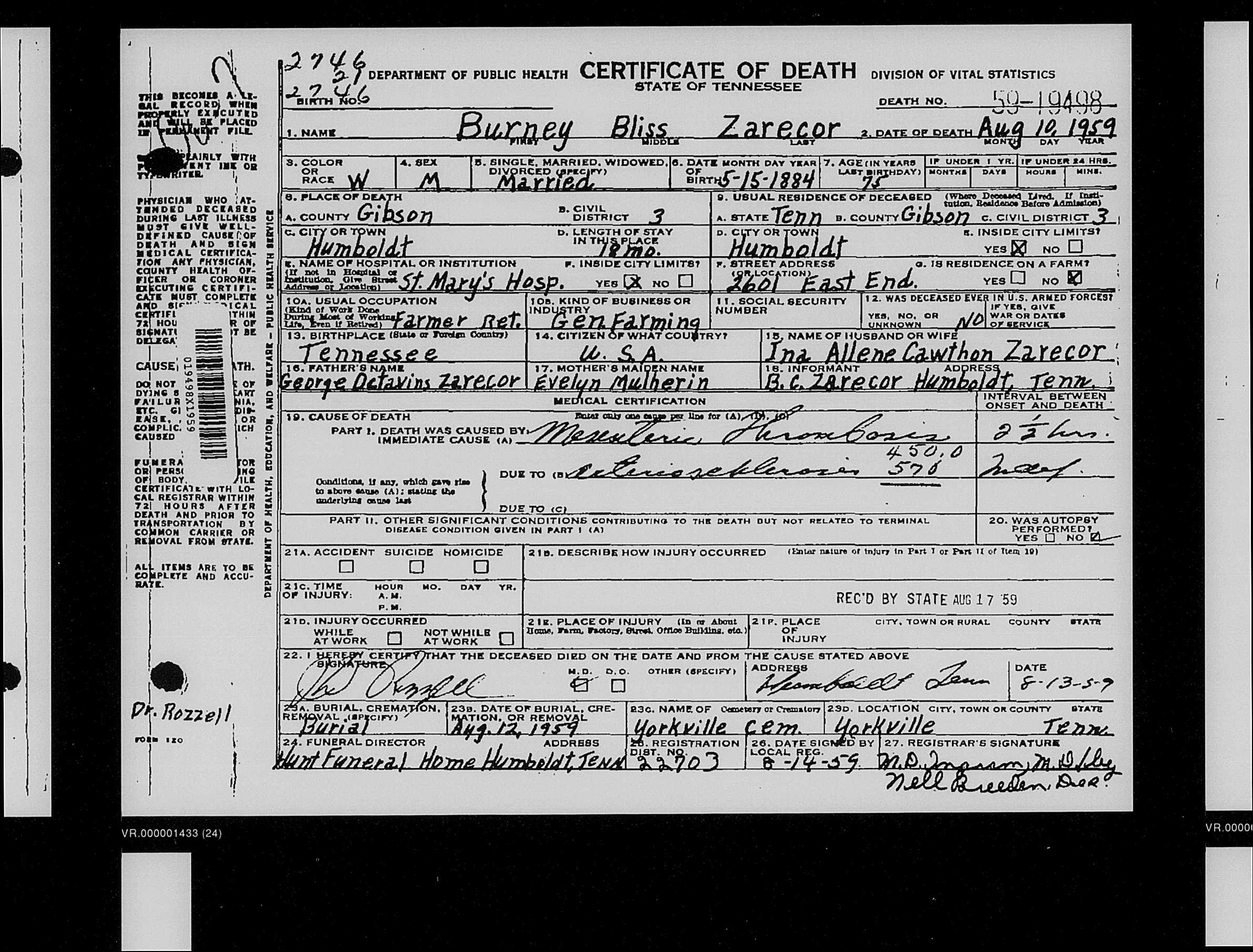 3040. Burney Bliss Zarecor, “Tennessee Death Recors, 1914-1955,” August 10, 1959, Humboldt, Gibson County, TN, https://familysearch.org/ark:/61903/1:1:QKMS-SVMX.