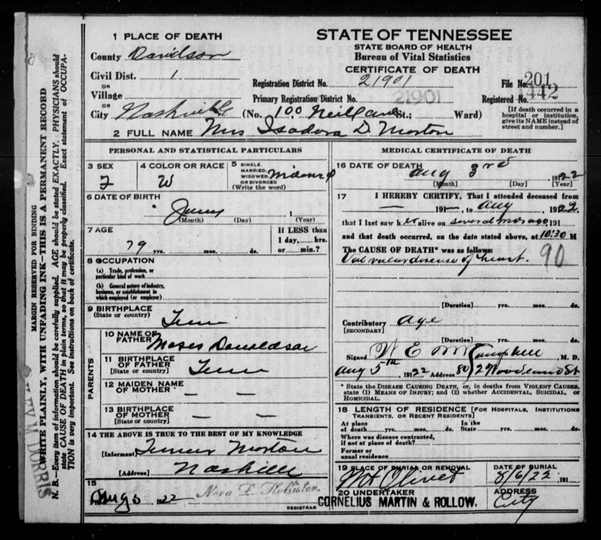 3046. Isadora D Morton, “Tennessee Death Records, 1914-1955,” microfilm, digital folder number: 4184082-image number: 208-film number: 1299742-volume/page/certificate number: v 10 cn 201, https://familysearch.org/pal:/MM9.1.2/M1WQ-8XZ/p1.