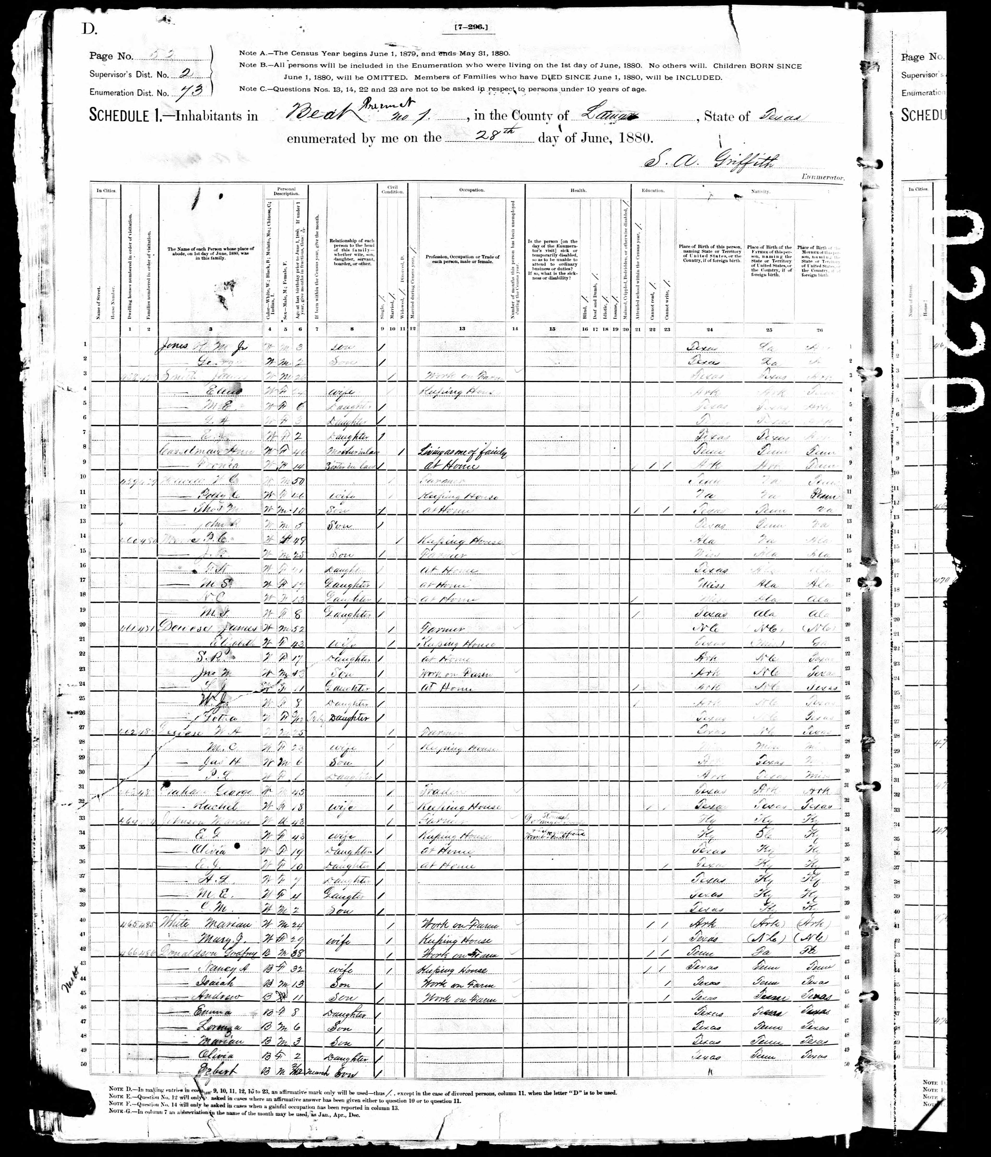 3063. “United States Census,” 1880, TX, Lamar, Precinct 1, 26D, 2, 73, 1314, 52, Bureau of the Census, US Dept. of Commerce, United States of America, June 28, 1880, S A Griffith.