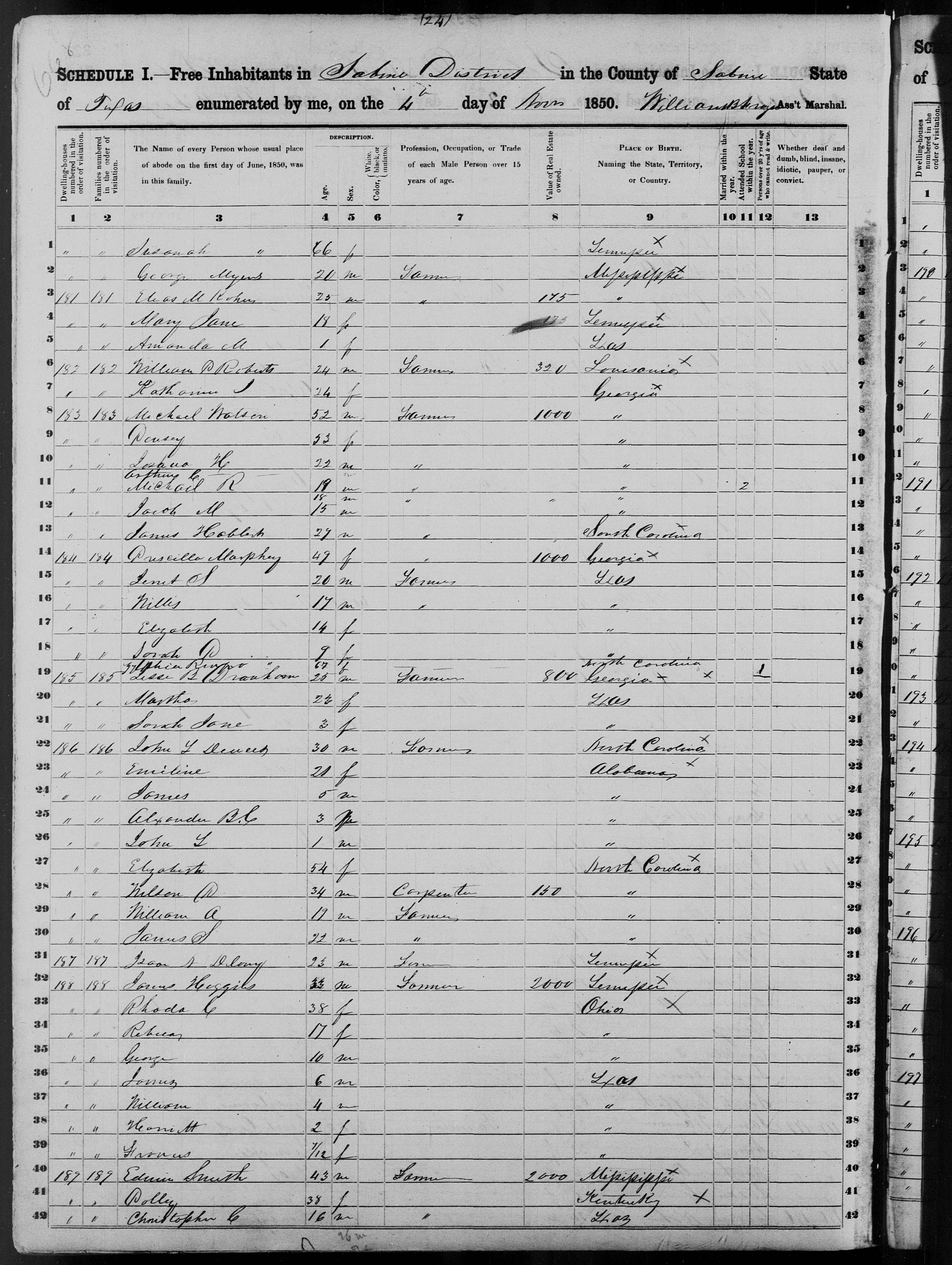 3065. “United States Census,” 1850, TX, Sabine, Sabine, 668, M432, 914, 322, 24, Bureau of the Census, US Dept. of Commerce, United States of America, November 4, 1850, William B Froyn.