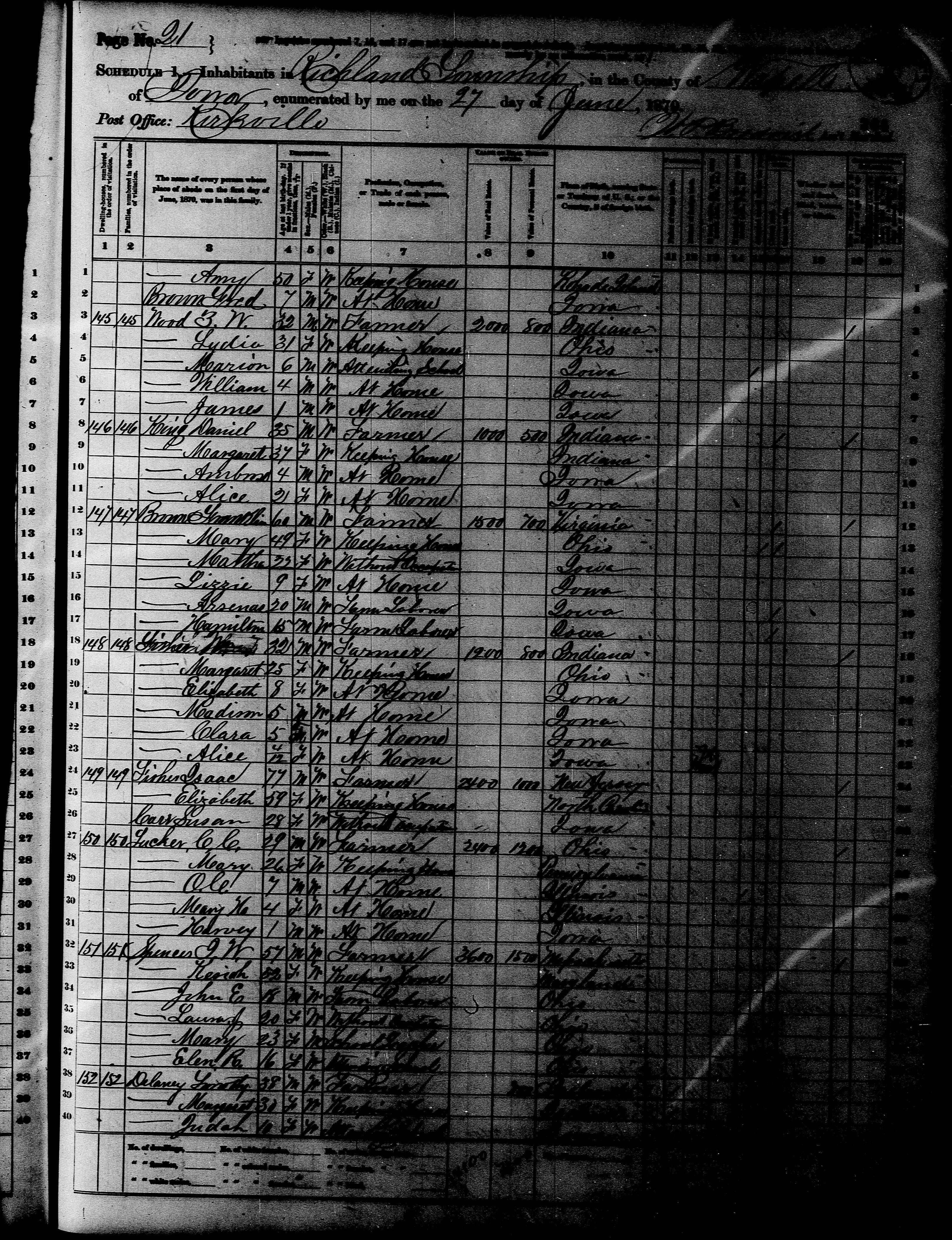 3118. “United States Census,” 1870, IA, Wapello, Richland, Kirkville, 21, M593, 545921, Bureau of the Census, US Dept. of Commerce, United States of America, June 27, 1870.