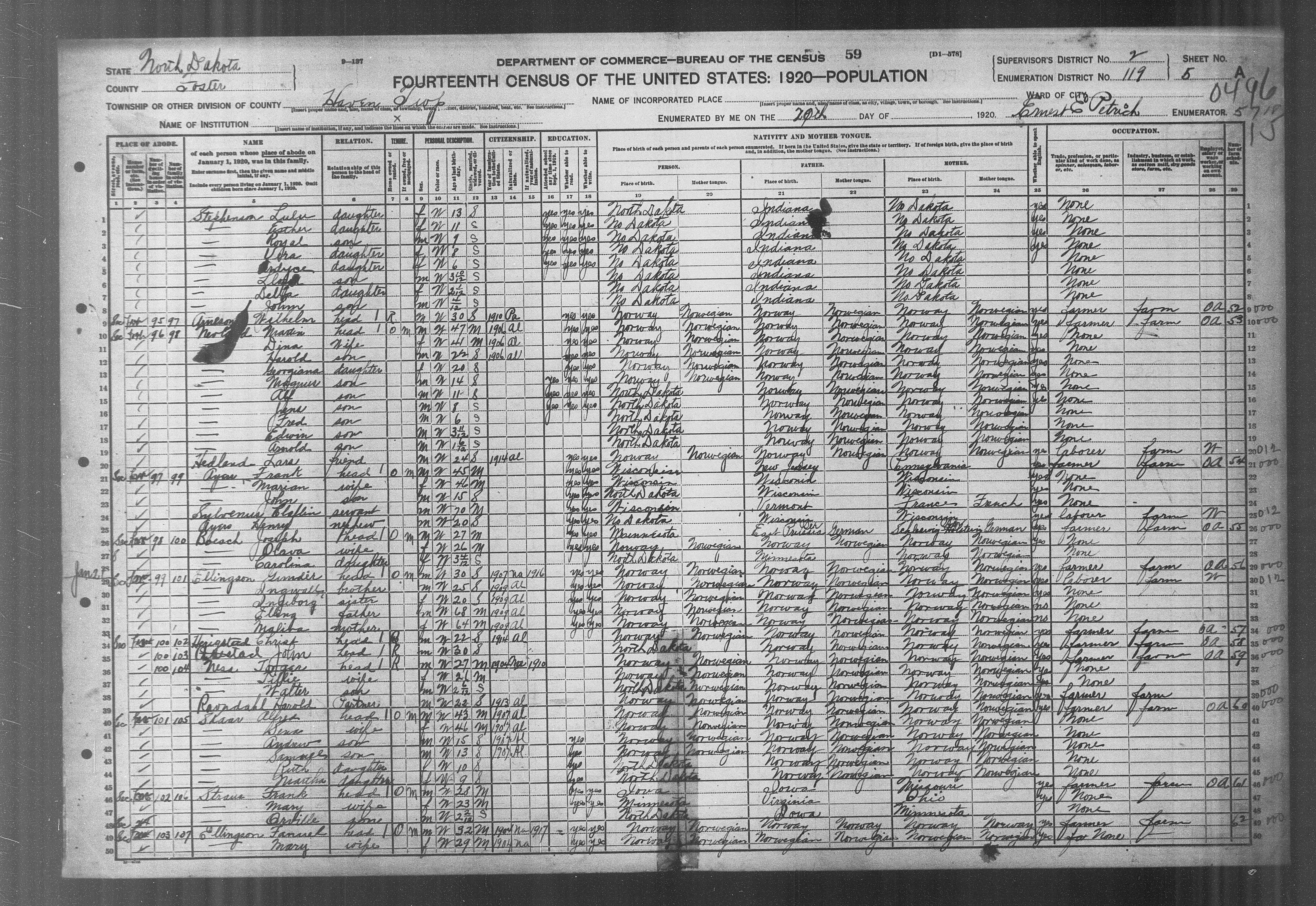 3146. “United States Census,” 1920, ND, Foster, Haven, 5A, 2, 119, T625, 1821334, 496, 121, Bureau of the Census, US Dept. of Commerce, United States of America, January 20, 1920, Ernest E Petrich.
