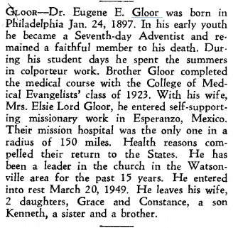 Gloor--Dr. Eugene E. Gloor was born in Philadelphia Jan. 24, 1897. In his early youth he became a Seventh-day Adventist and remained a faithful member to his death. During his student days he spent the summers in colporteur work. Brother Gloor completed the medical courses with the College of Medical Evangelists’ class of 1923. With his wife, Mrs. Elsie Lord Gloor, he entered self-supporting missionary work in Esperanzo, Mexico. Their mission hospital was the only one in a radius of 150 miles. Health reasons compelled their return to the States. he has been a leader in the church in the Watsonville area for the past 15 years. He entered into rest March 20, 1949. He leaves his wife, 2 daughters, Grace and Constance, a son Kenneth, a sister and a brother.
