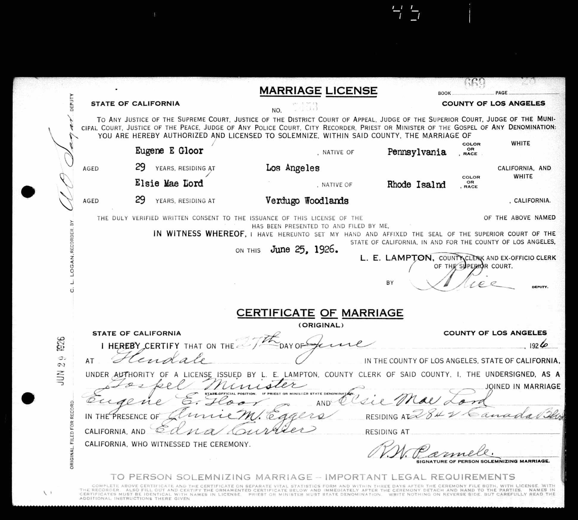 3155. Eugene E Gloor and Elsie Mae Lord, “California, County Marriages, 1850-1952,” June 27, 1926, Los Angeles, Los Angeles County, CA, USA, Page: 23-GS Film number: 2074648-Digital Folder Number: 005698457-Image Number: 00049, https://familysearch.org/pal:/MM9.1.1/K8NJ-FRD.
