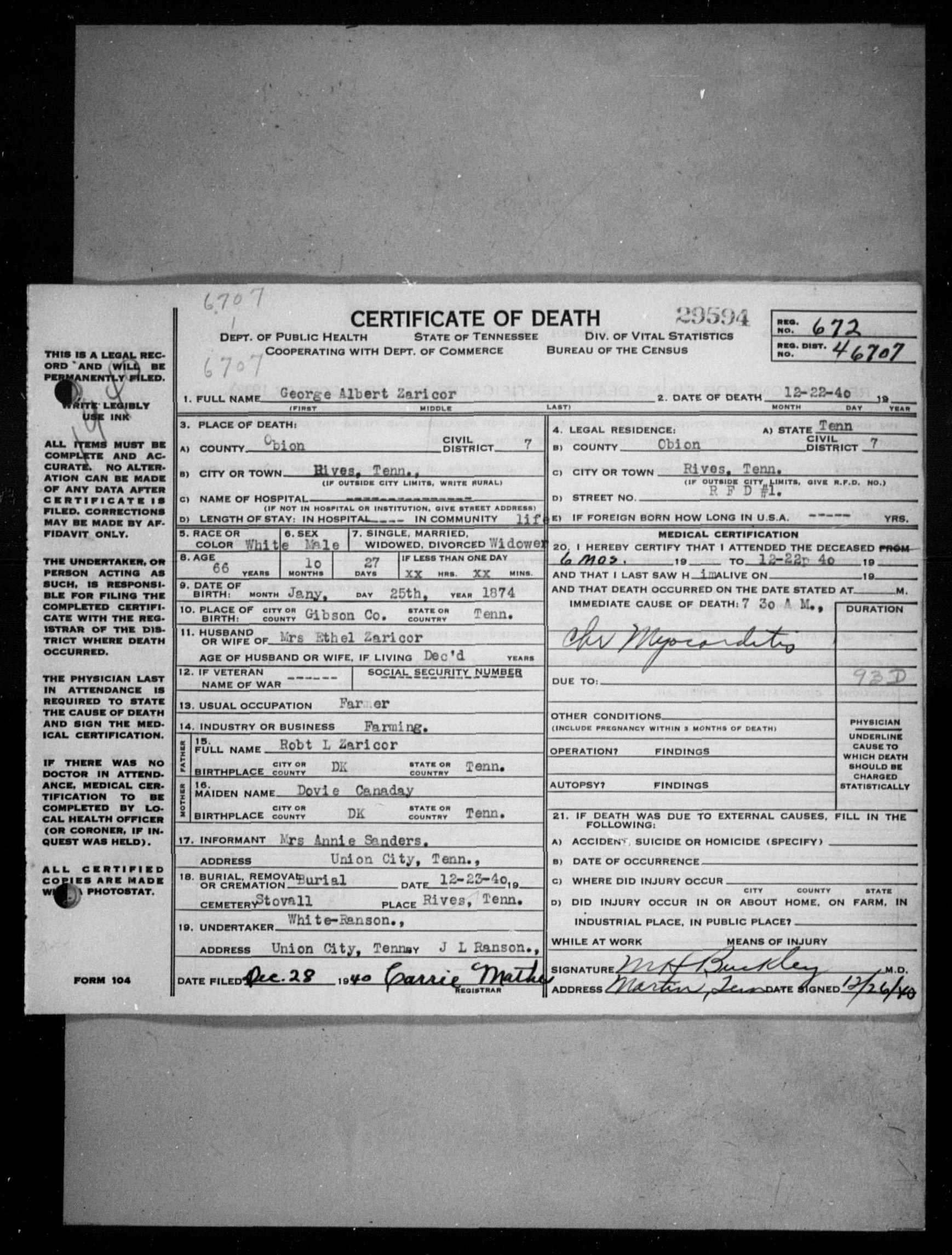 3196. George Albert Zaricor, “Tennessee Death Records, 1914-1955,” microfilm, digital folder number: 4184459-image number: 2348-film number: 1876894-volume/page/certificate number: cn 29594, https://familysearch.org/pal:/MM9.1.1/N9BM-L5X.